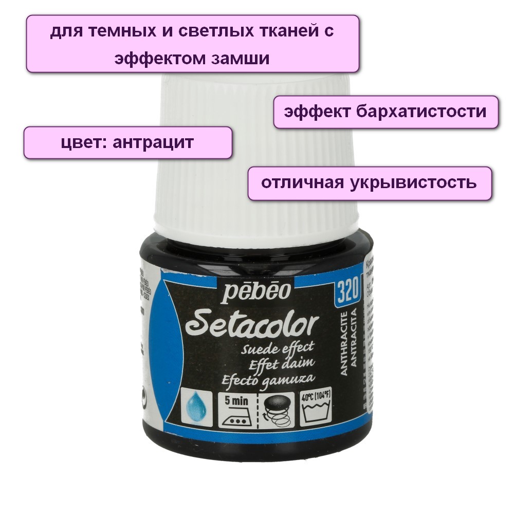 Непрозрачные краски Setacolor с эффектом замши наносятся на предварительно выстиранные ткани, такие как: хлопок, шерсть, хлопок-шерсть, трикотаж, джерси, бархат,