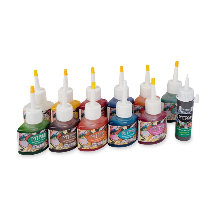 Краски от «Аква–Колор» — яркие, прозрачные, хорошо смешиваются, образуя красивые оттенки. С их помощью Вы можете творить в свое удовольствие, создавая оригинальные картины или заполняя уже готовые шаблоны. Наши витражные краски купить Вы можете в наборе 11 цветов с удобными носиками-дозаторами.