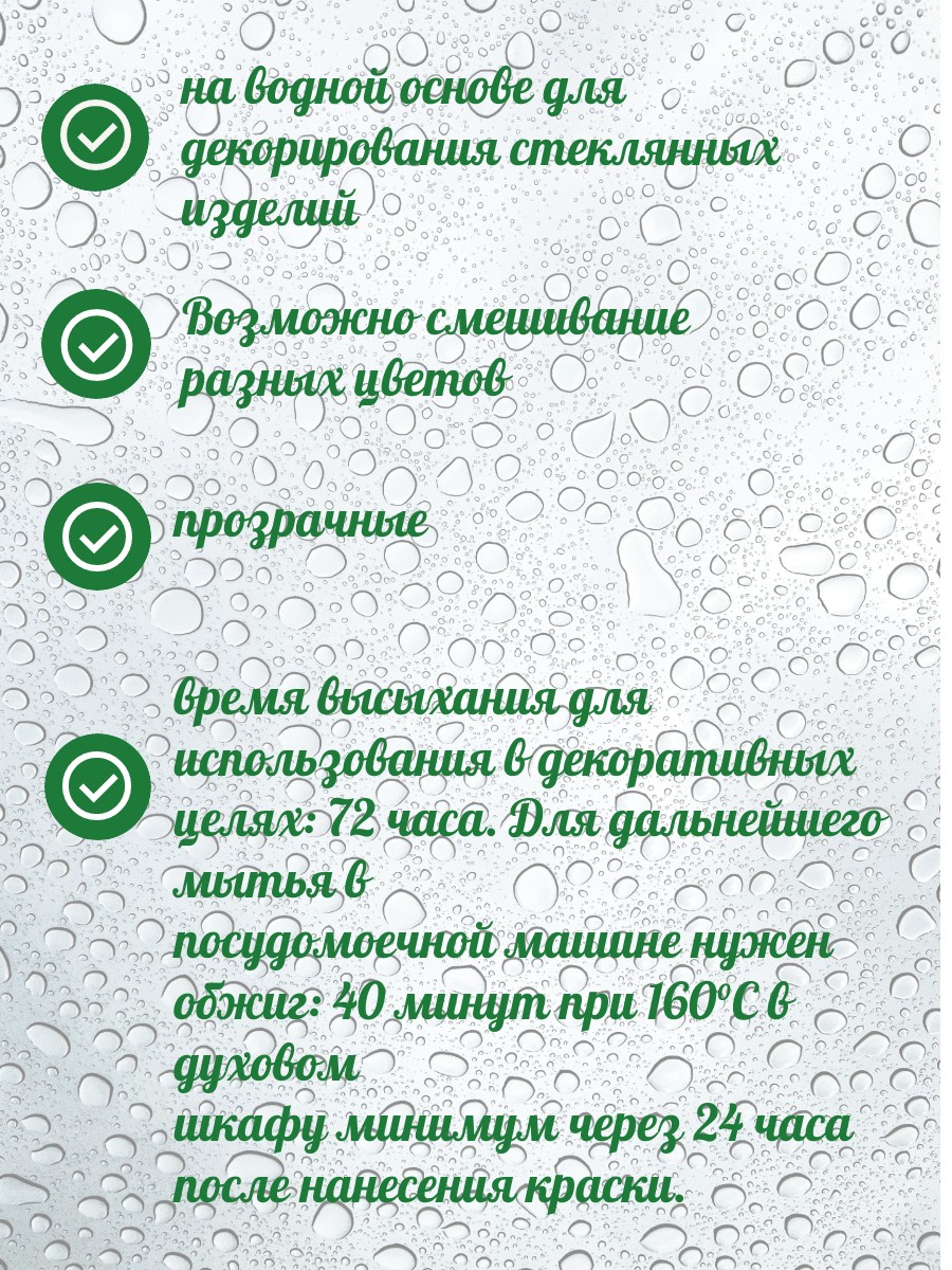 После обжига при 160°C в бытовом духовом шкафу краски становятся более насыщенными и глубокими. Изделие приобретает вид цветного стекла. Краски Vitrea160 можно наносить на другие поверхности, способные выдержать температуру обжина 160°C. Краски во флаконах, также более густые в тубах и маркерах Vitrea 160 обладают одинаковыми характеристиками и свойствами. Используемые в одной работе, позволяют разнообразить эффекты и техники.