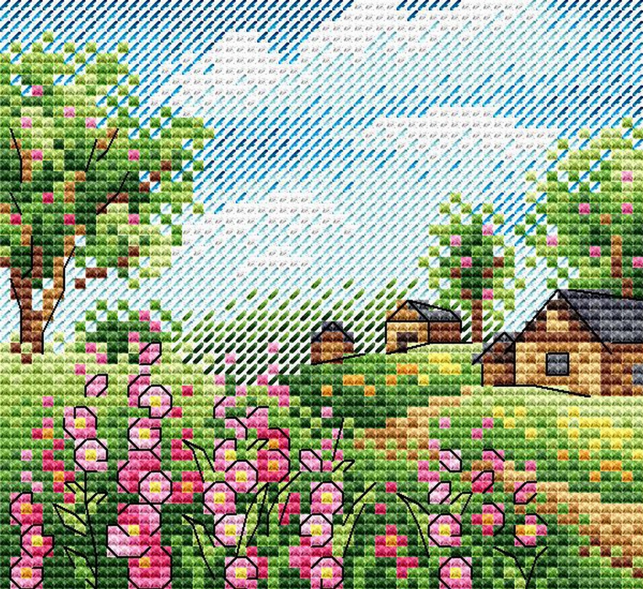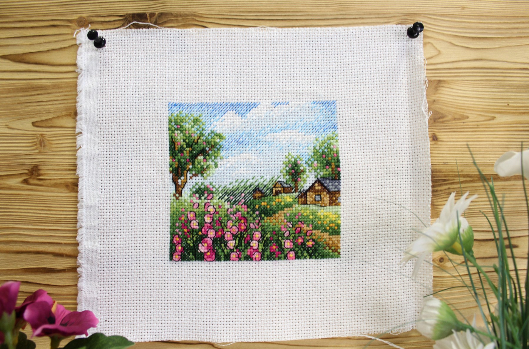 Состав набора канва №14, нитки мулине ПНК им. Кирова 22 цвета, черно-белая схема, игла, инструкция..