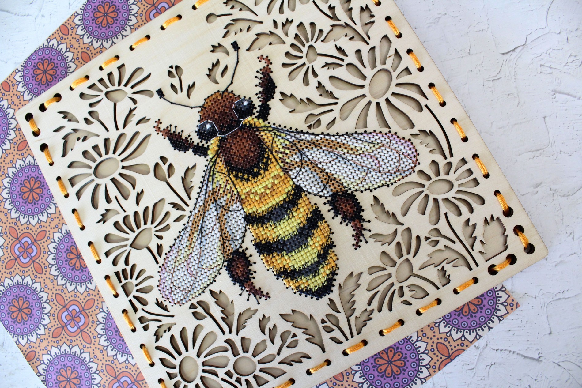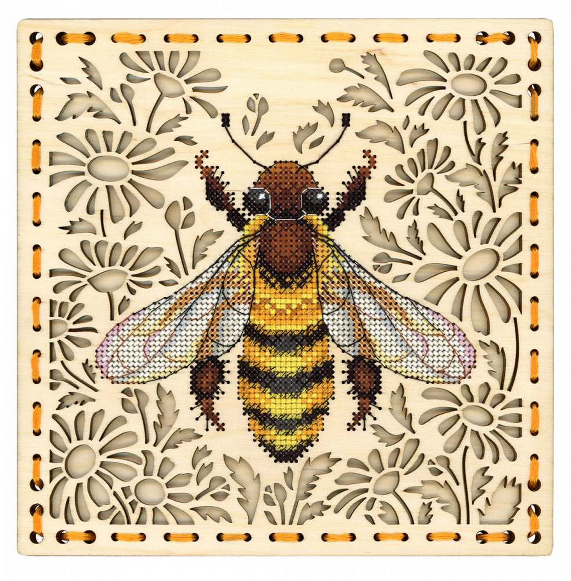 Состав: деревянная перфорированная заготовка, мулине ПНК им. Кирова 13 цветов, схема, игла, инструкция.