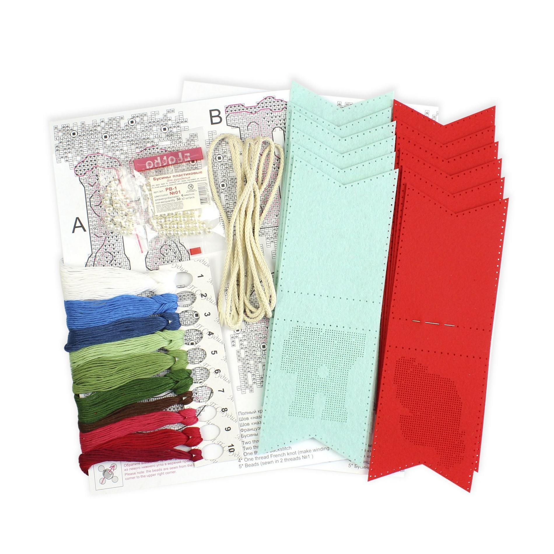 В состав набора входит: заготовки с перфорацией из фетра красного и светло-голубого цвета, нитки мулине ПНК им.Кирова 10 цветов, бусины 1 цвета, шнур для развески, игла, схема и руководство по вышиванию..