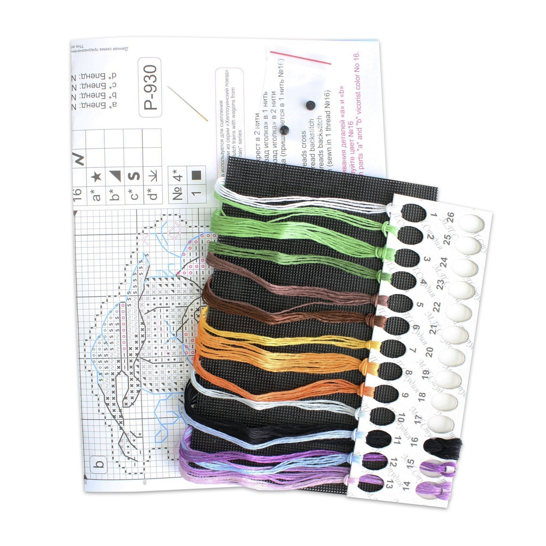 В состав набора входит: чёрная пластиковая канва 14 каунта, нити мулине ПНК им.Кирова 16 цветов, разобранные на органайзере, пуговица - 2 шт, игла, схема и руководство по вышиванию.