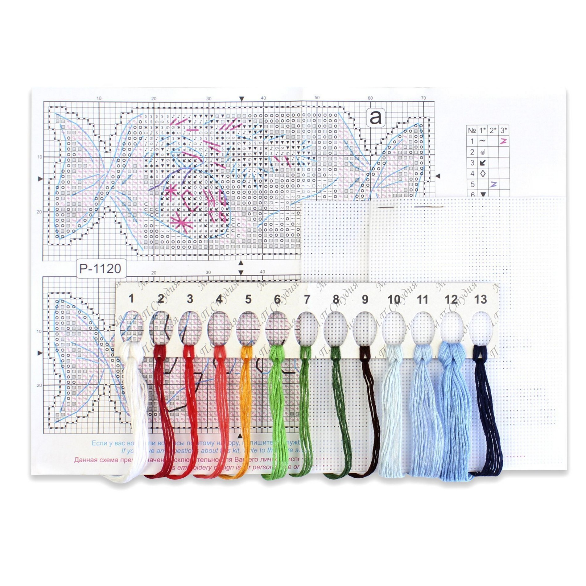 В состав набора входит: белая пластиковая канва 14 каунта, нитки мулине ПНК им.Кирова 13 цветов, разобранные на органайзере, игла, схема и инструкция...