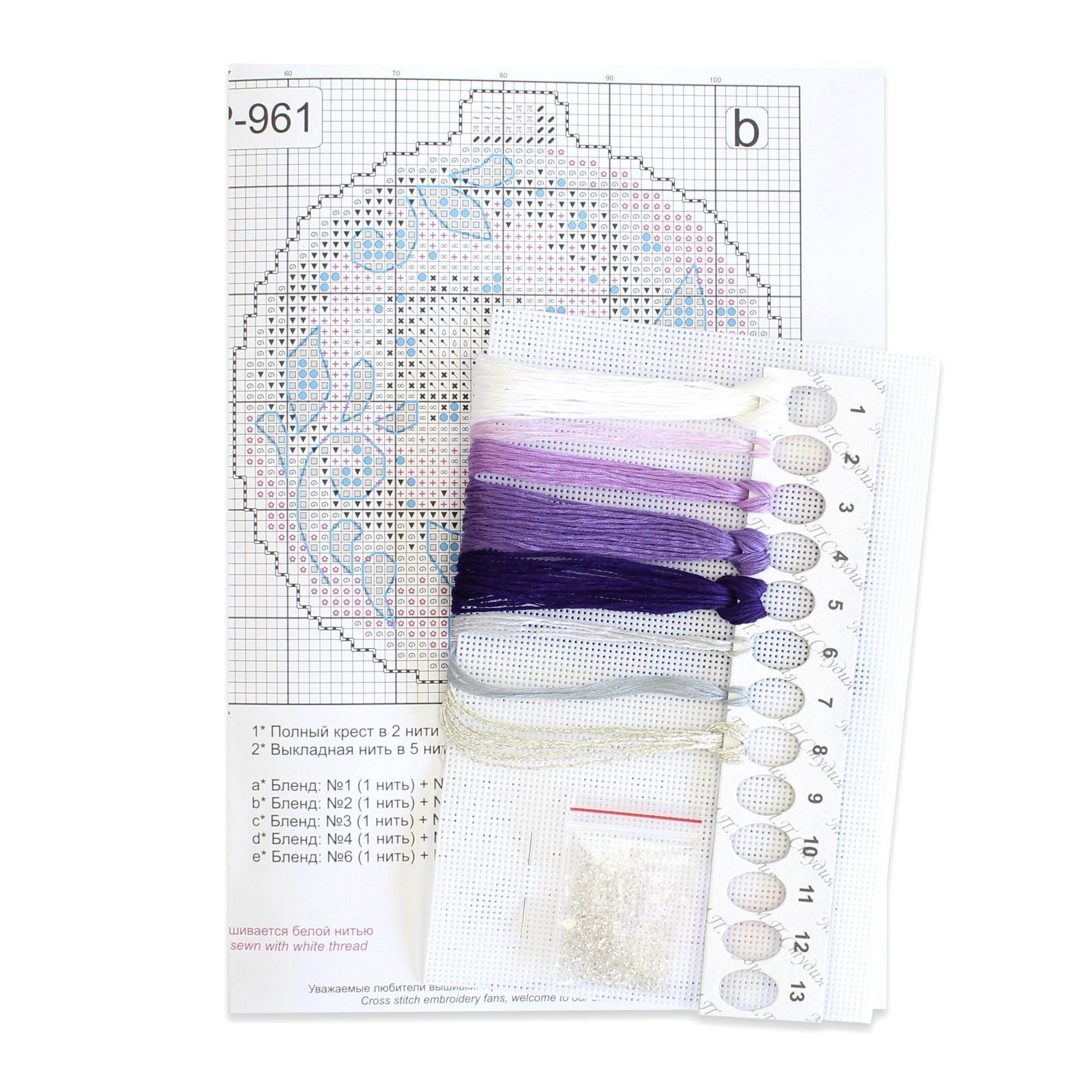 В состав набора входит: белая пластиковая канва 14 каунта, нитки мулине ПНК им.Кирова 8 цветов, разобранные на органайзере, бисер Preciosa - 1 цвет, игла, схема и инструкция..