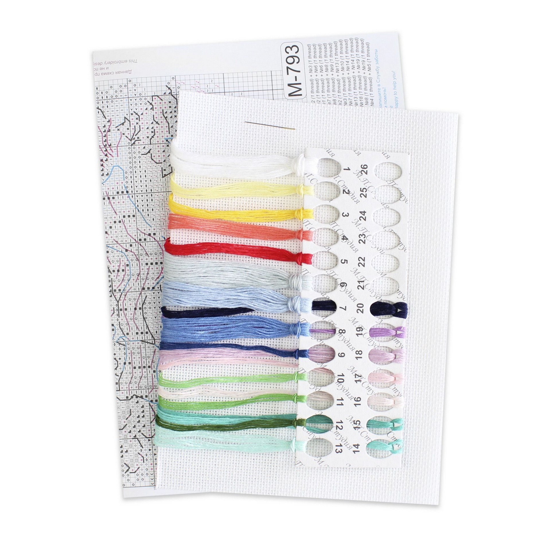В состав набора входит: белая канва 14 каунта, нитки мулине ПНК им.Кирова 20 цветов, разобранные на органайзере, игла, схема и руководство по вышиванию...