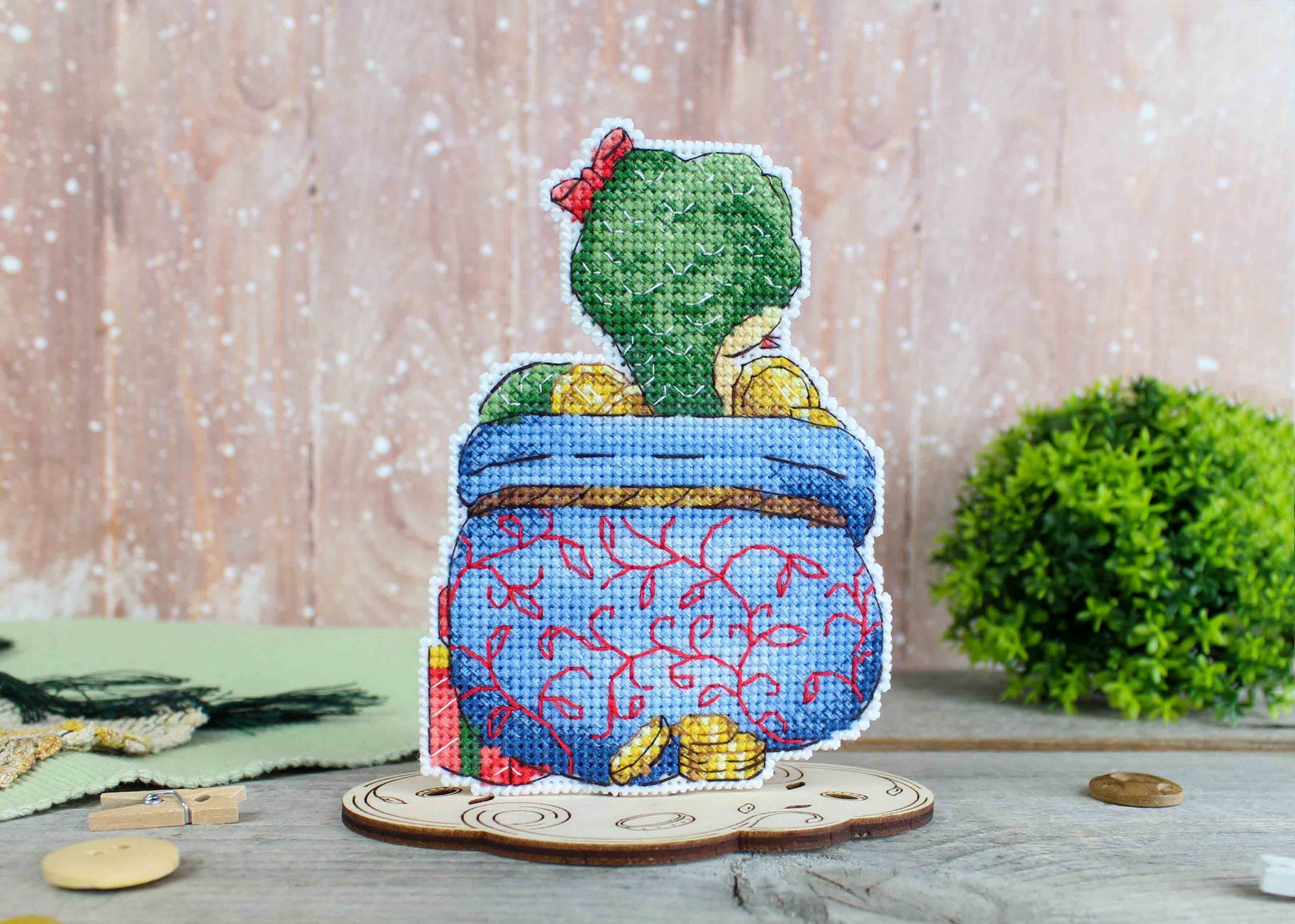 В состав набора входит: белая пластиковая канва 14 каунта, нитки мулине ПНК им.Кирова 18 цветов, разобранные на органайзере, игла, бумажная схема и инструкция..