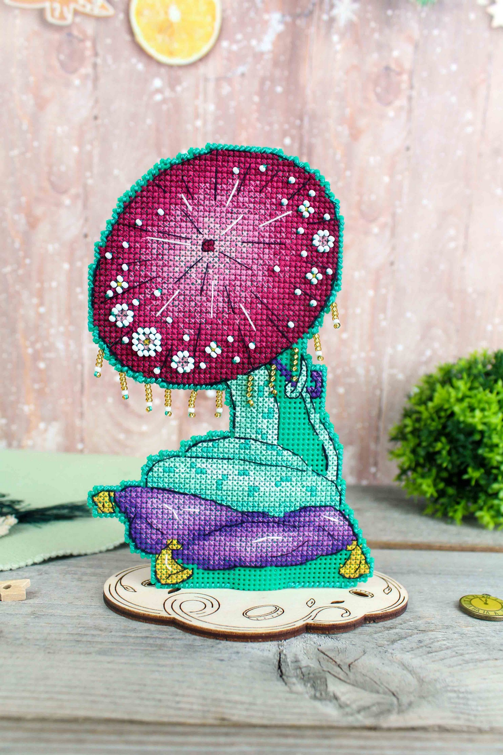 В состав набора входит: зелёная пластиковая канва 14 каунта, нитки мулине ПНК им.Кирова 15 цветов, разобранные на органайзере,бисер Preciosa - 2 цвета, игла, бумажная схема и инструкция.