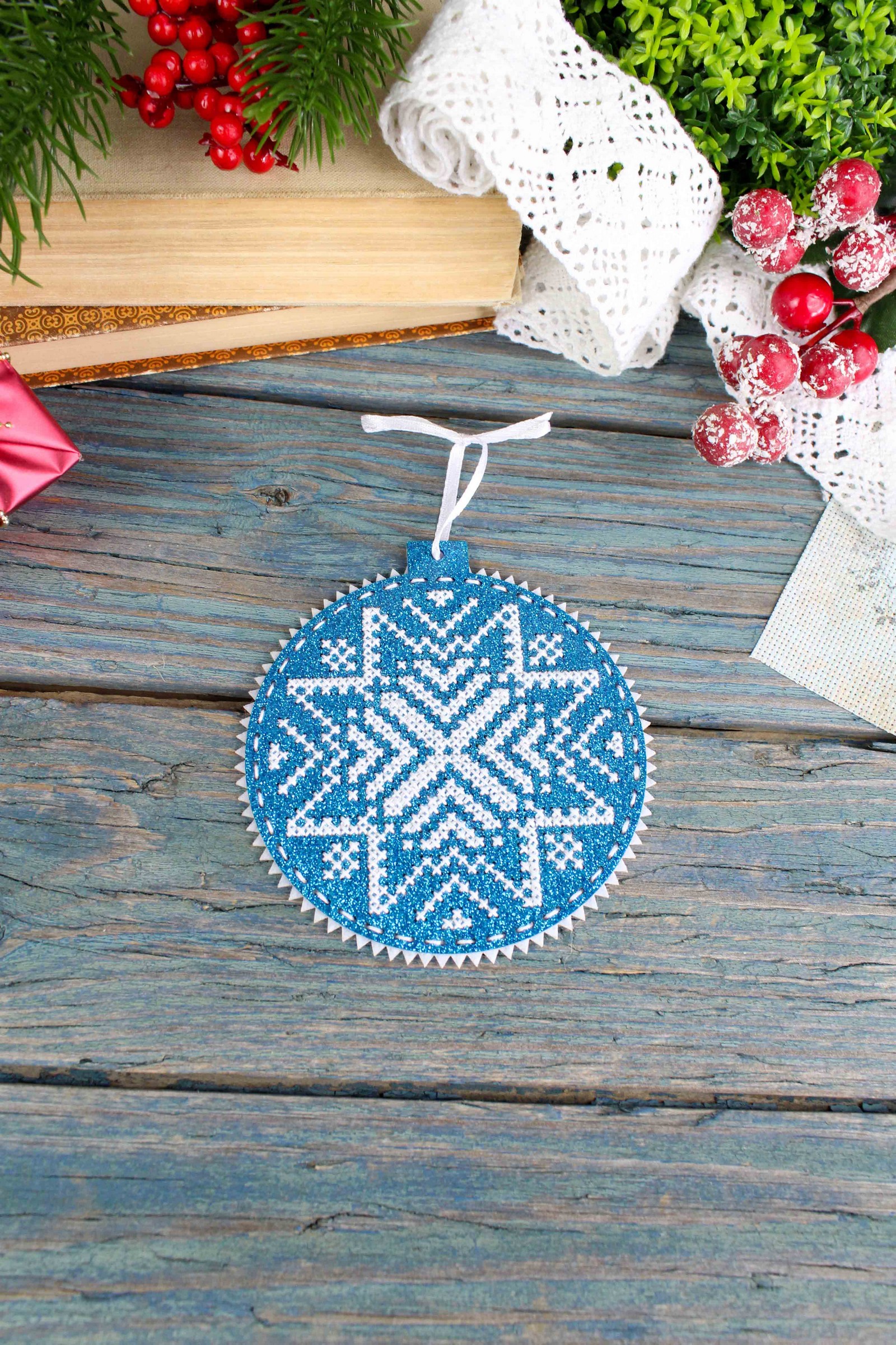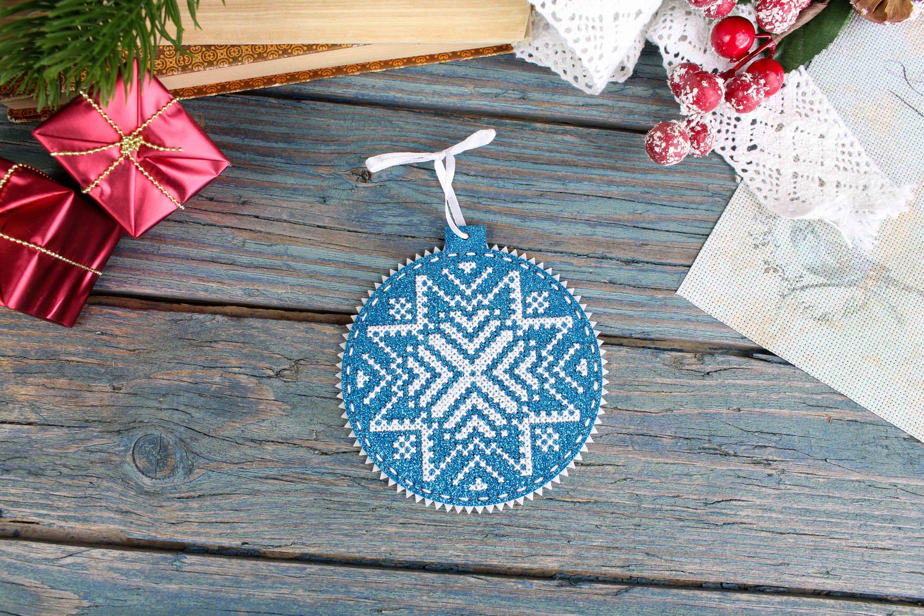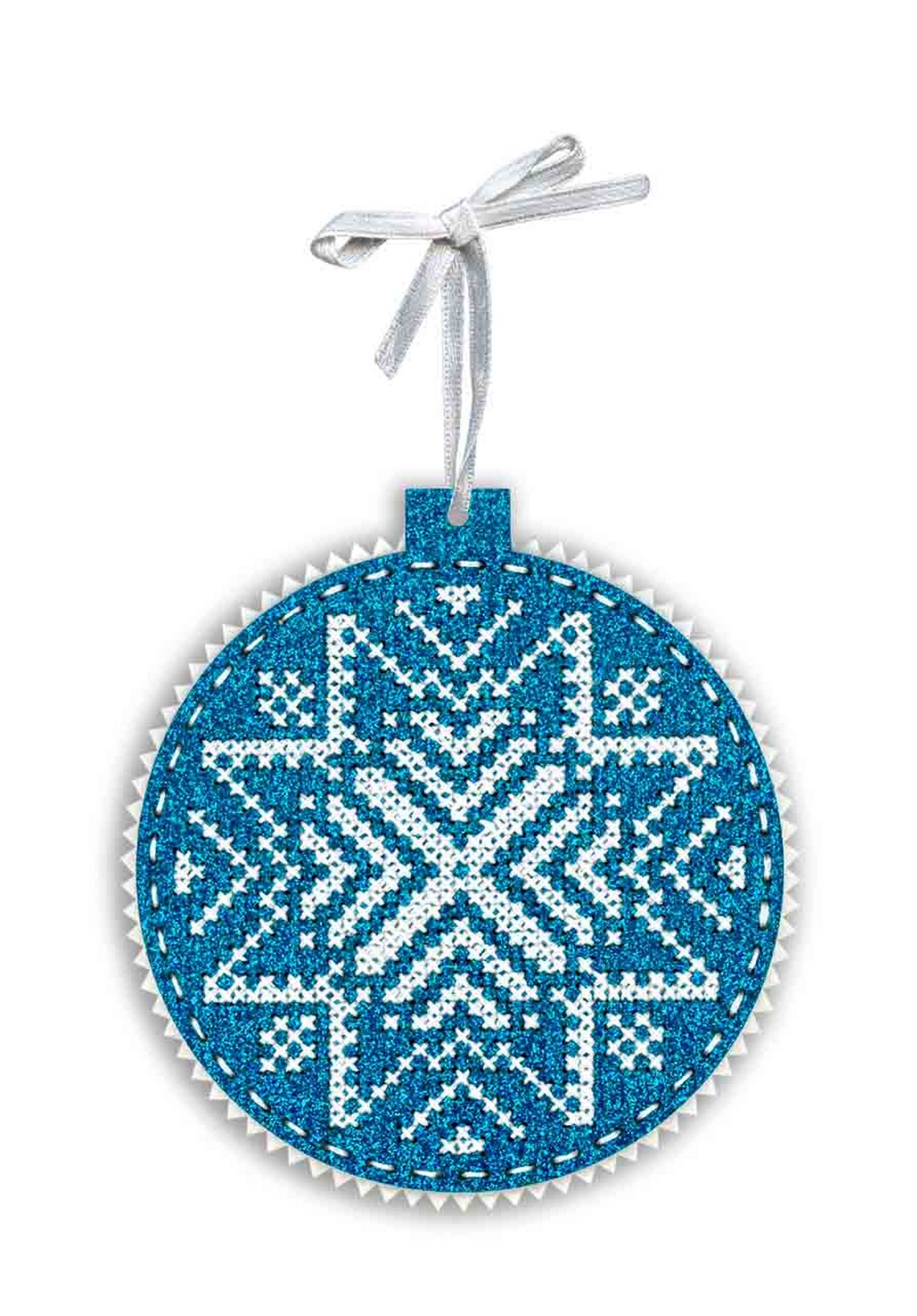 В состав набора входит: перфорированная основа из глиттированного фетра, фетр для обработки изнанки, мулине ПНК им.Кирова 1 цвета, игла, атласная лента, двуцветная символьная схема, инструкция..