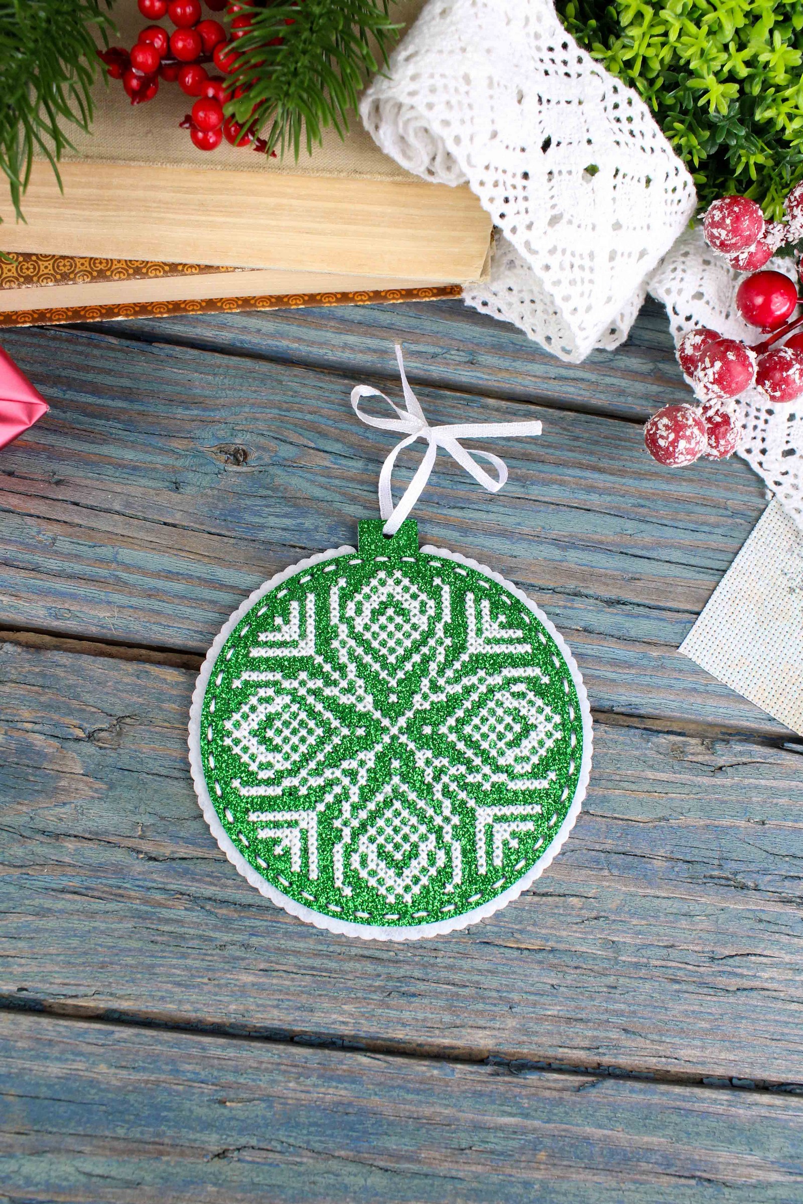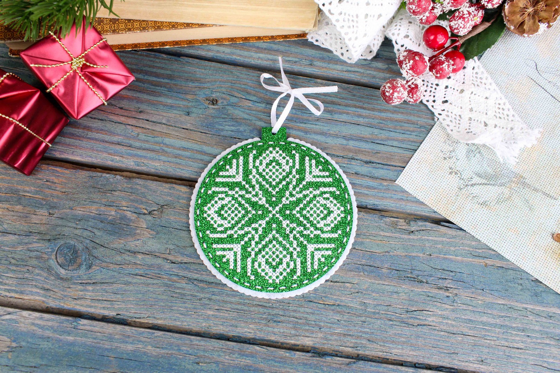 В состав набора входит: перфорированная основа из глиттированного фетра, фетр для обработки изнанки, мулине ПНК им.Кирова 1 цвета, игла, атласная лента, двуцветная символьная схема, инструкция..