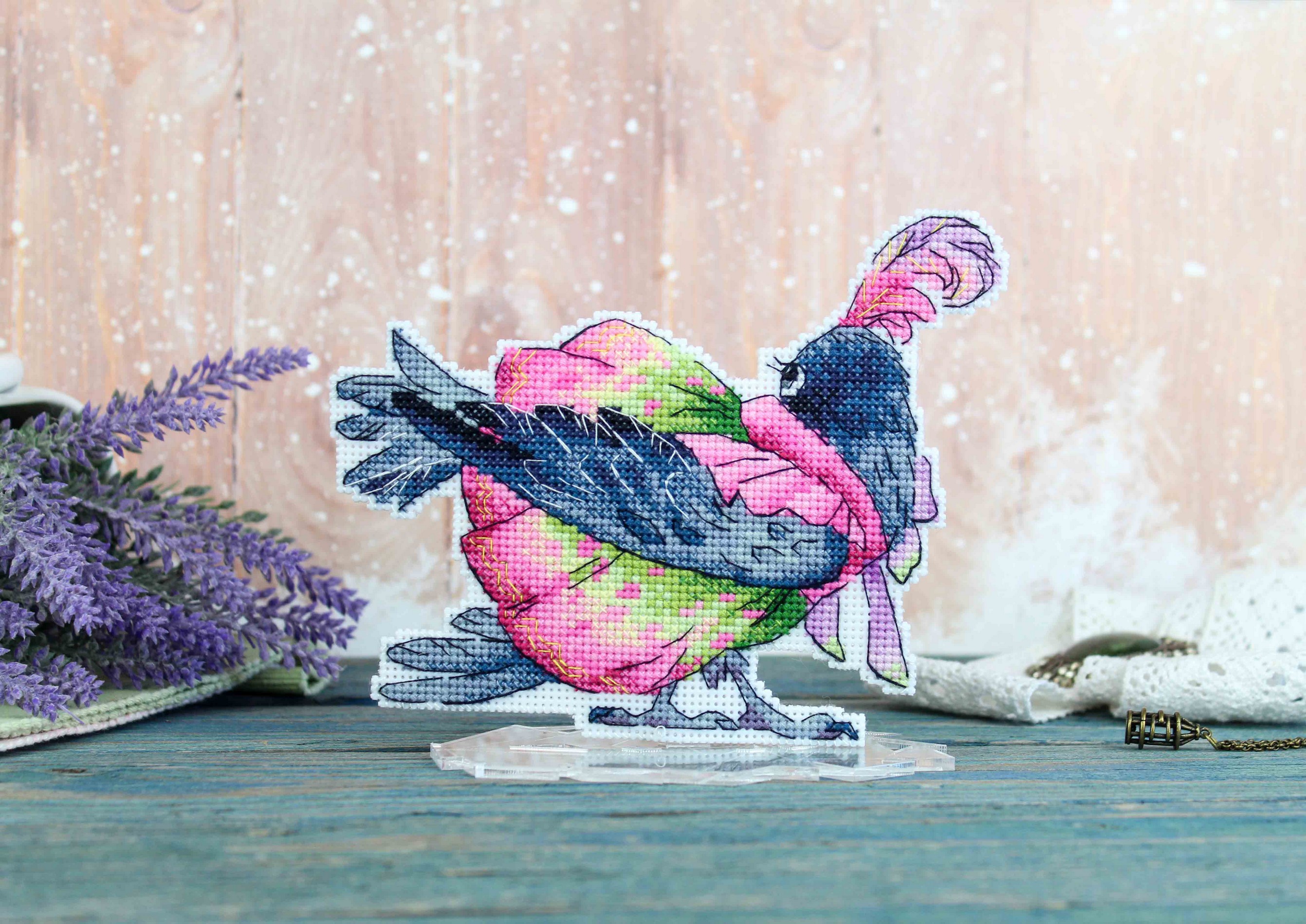 В состав набора входит: белая пластиковая канва 14 каунта, нитки мулине ПНК им.Кирова 22 цвета, разобранные на органайзере, декор пуговица - 2 шт, игла, бумажная схема и инструкция..