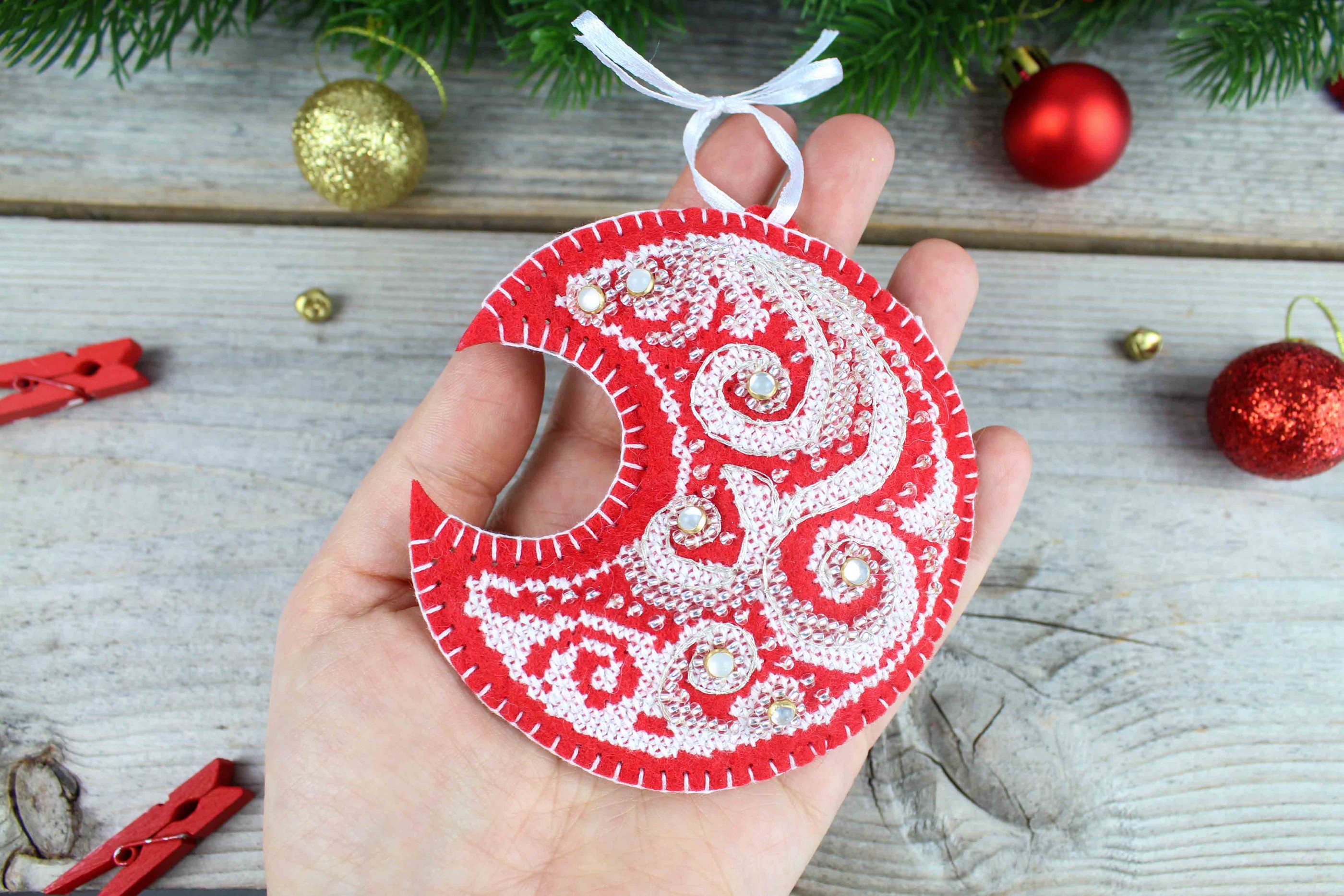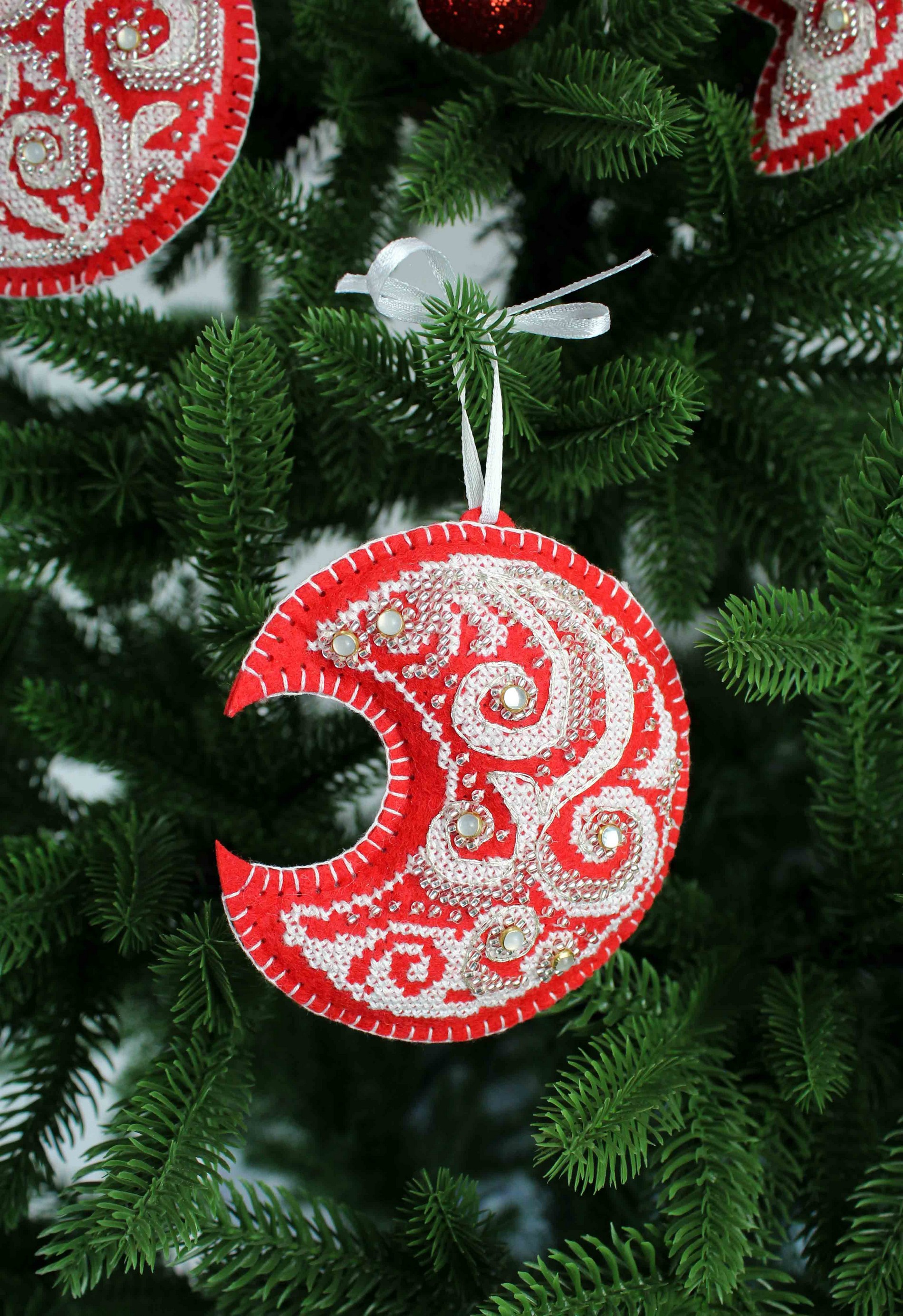 В состав набора входит: заготовка с перфорацией из фетра красного цвета, нитки мулине ПНК им.Кирова 1 цвет, нитки металлик - 1 цвет, бисер Preciosa - 1 цвет, пуговица - 9 шт, лента, синтепон, игла, схема и руководство по вышиванию..