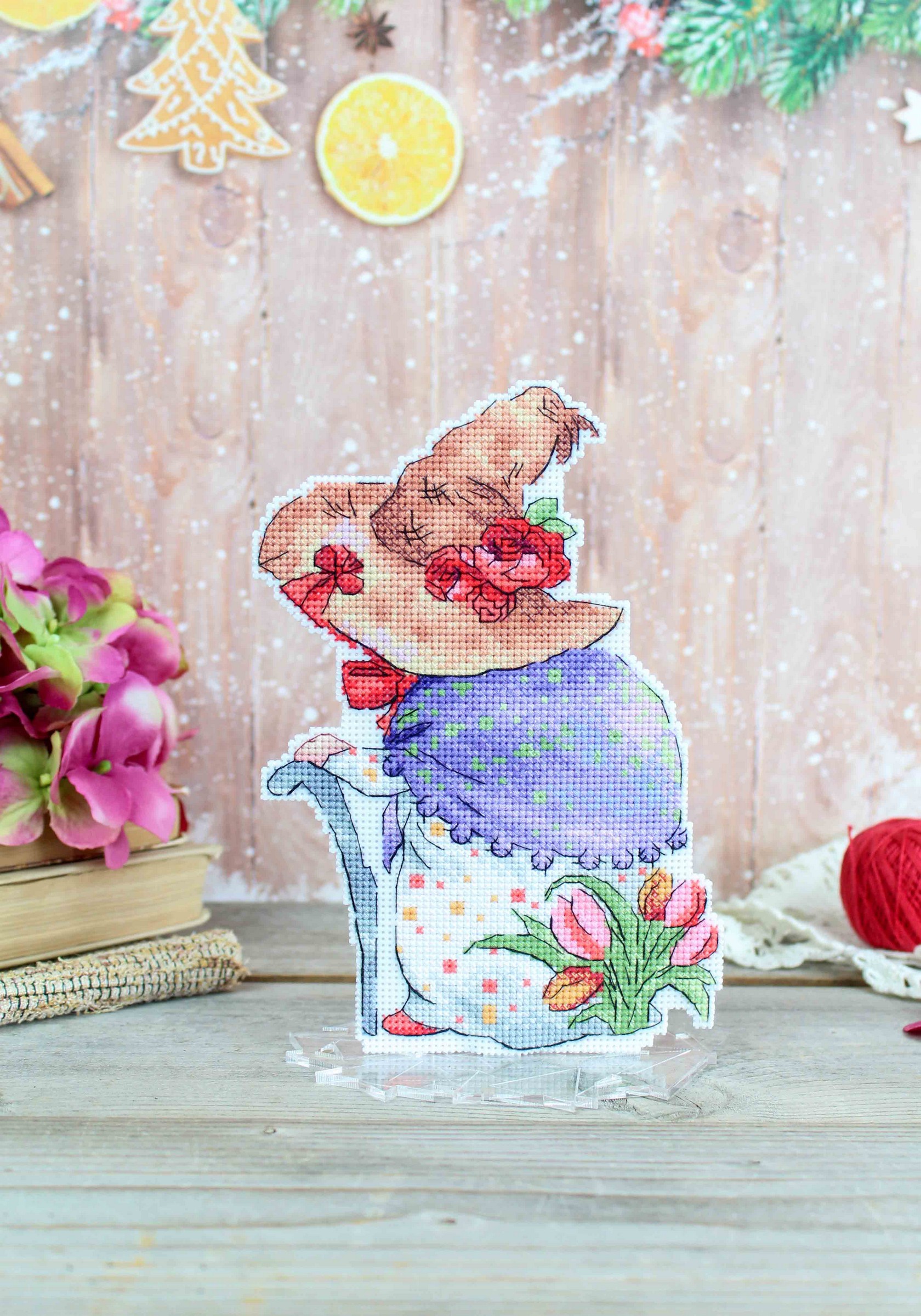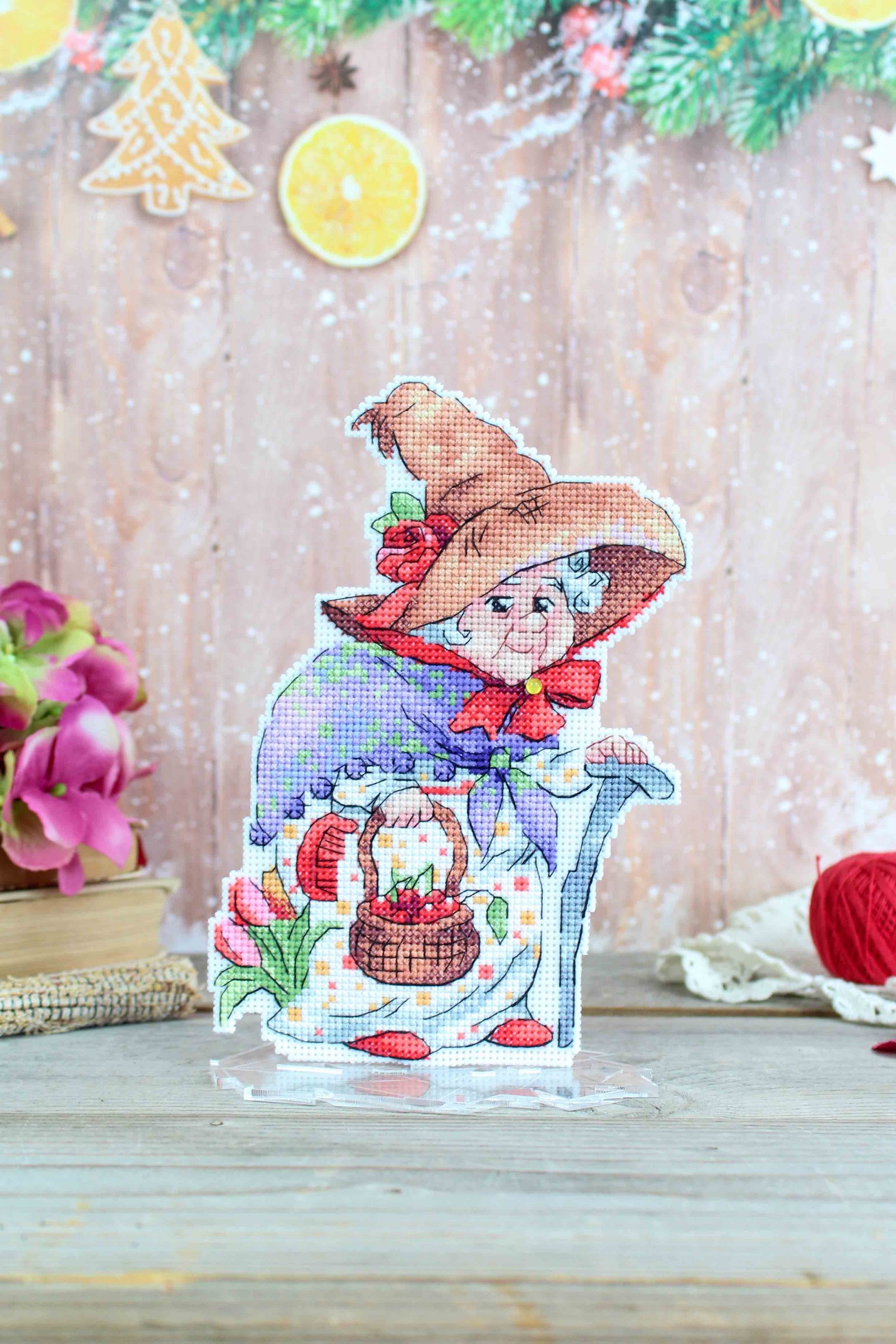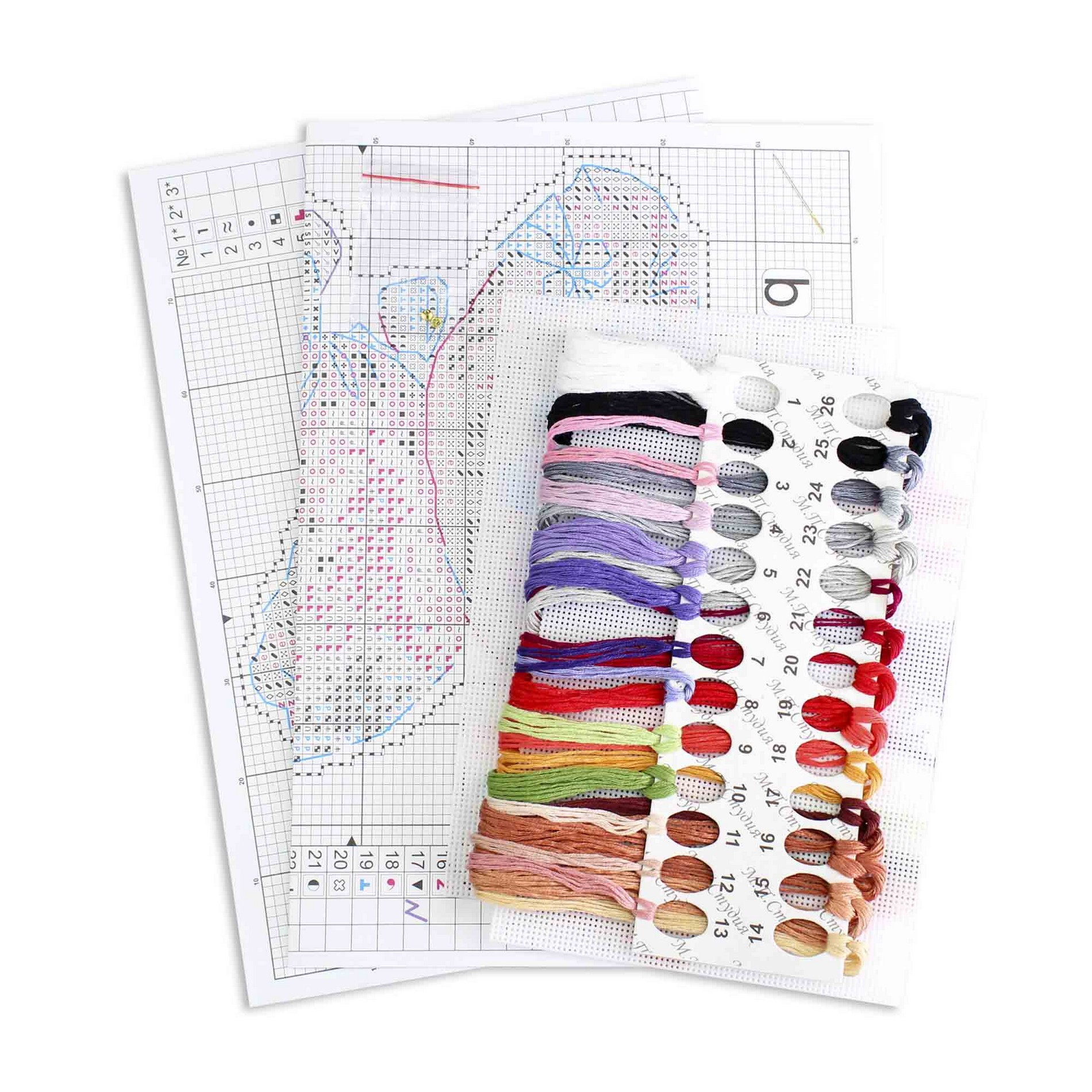 В состав набора входит: белая пластиковая канва 14 каунта, нитки мулине ПНК им.Кирова 26 цветов, разобранные на органайзере, пуговицы - 1 цвет, игла, схема бумажная и электронная Makosh, руководство по вышиванию.