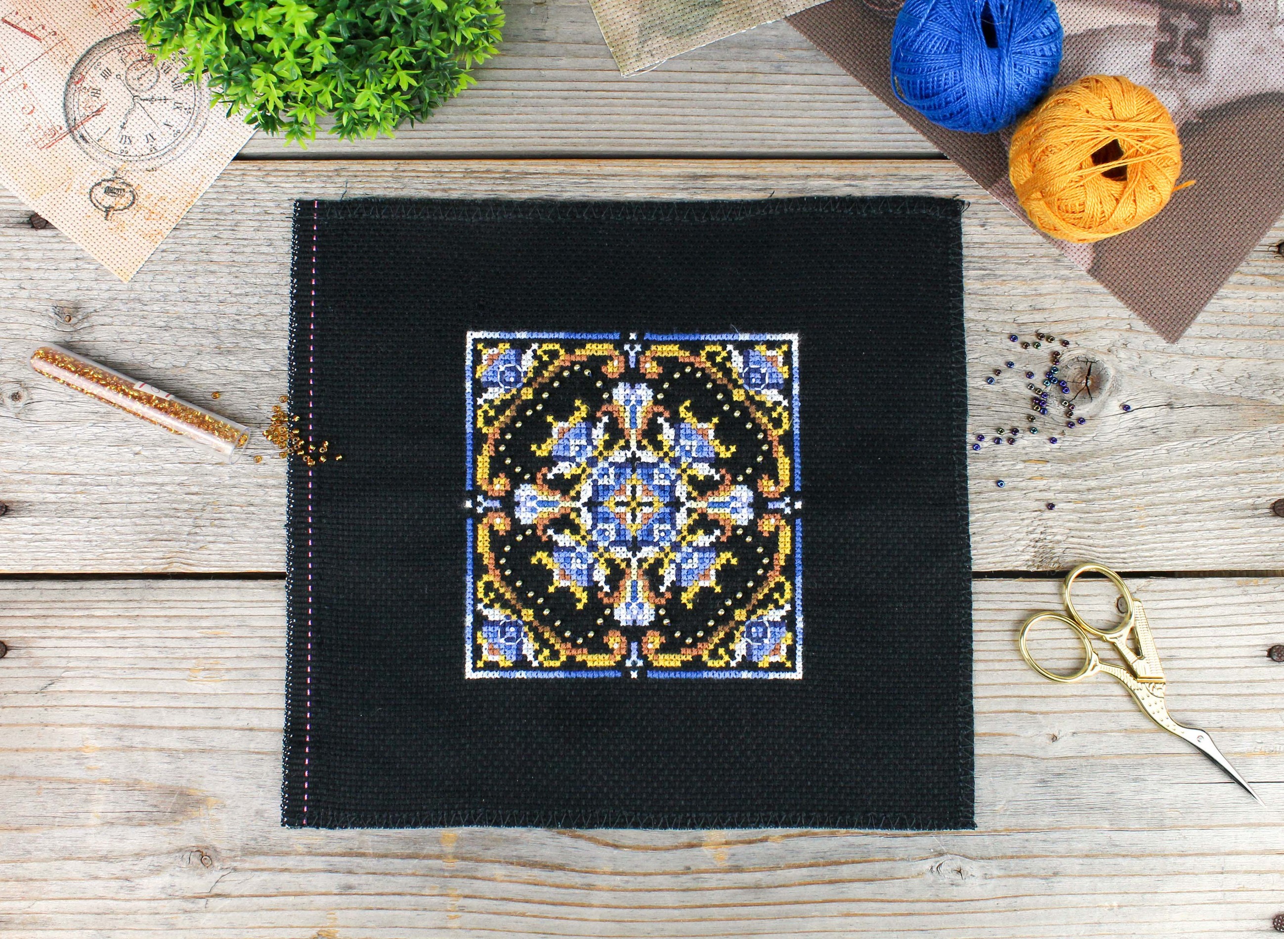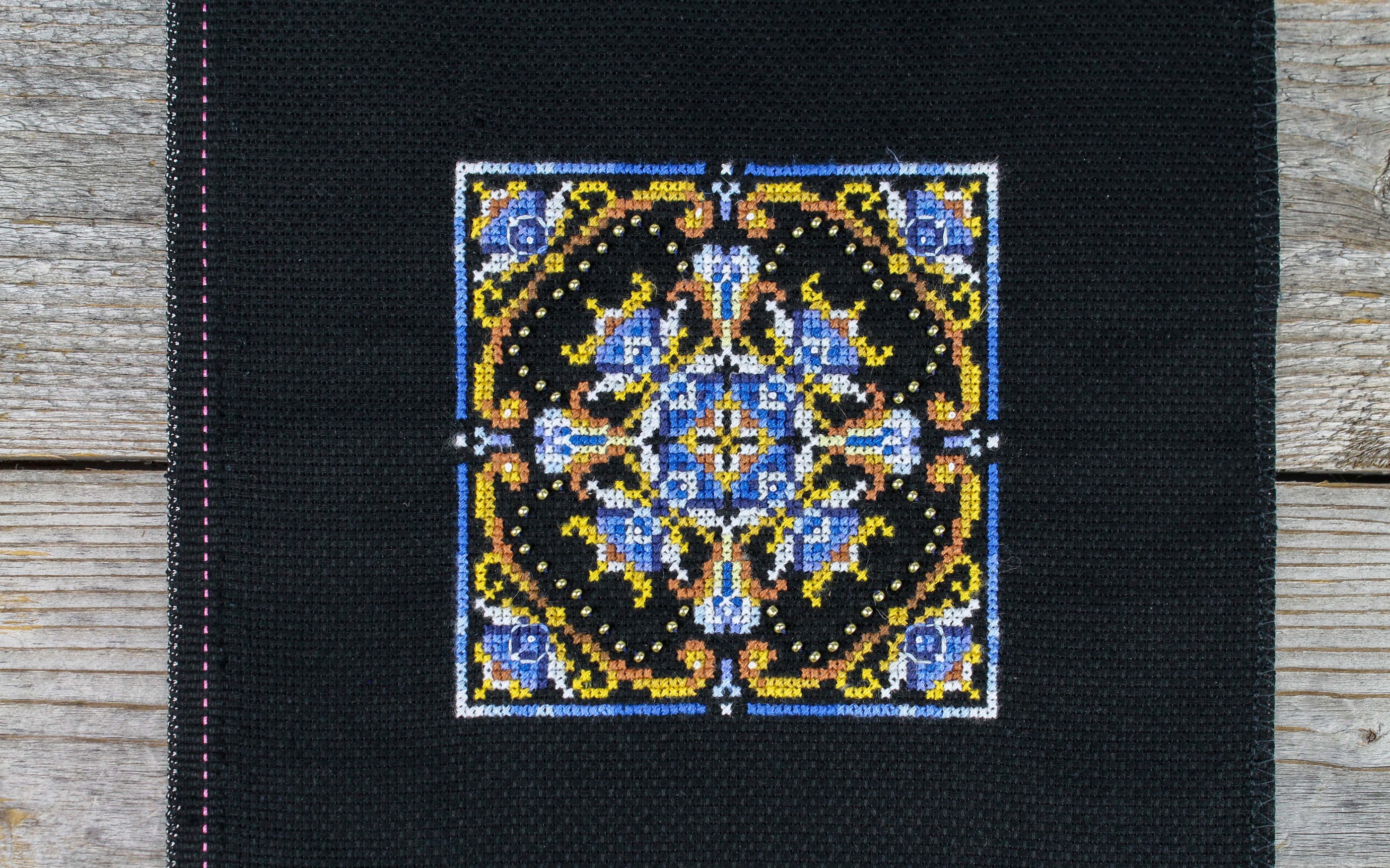 В состав набора: черная хлопчатобумажная канва 14 каунта, нитки мулине Гамма 12 цветов, разобранные на органайзере, бисер Preciosa - 1 цвет, игла, бумажная цвето-символьная схема и электронная схема Makosh, вышивальная линейка, нитковдеватель, руководство по вышиванию..