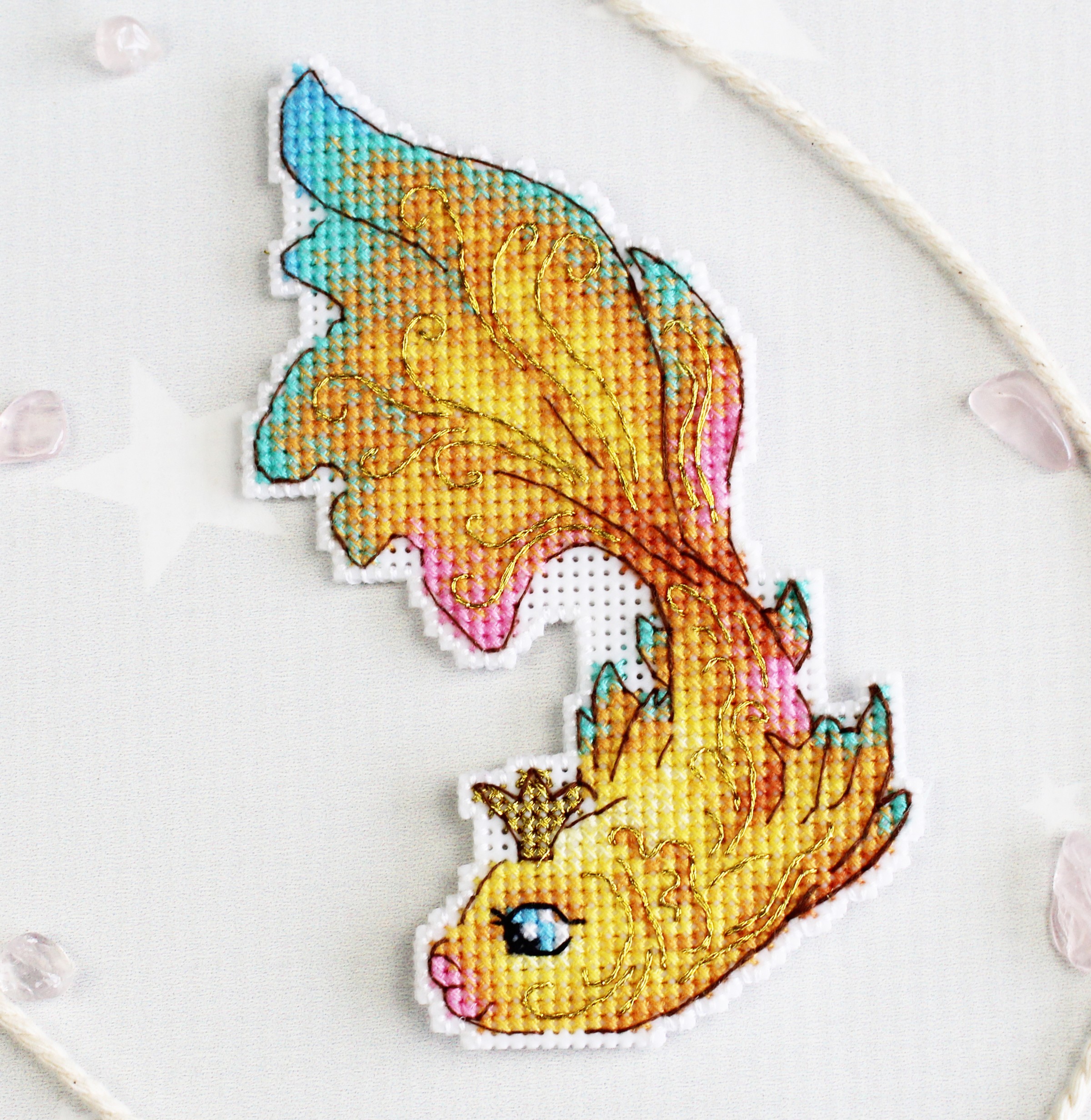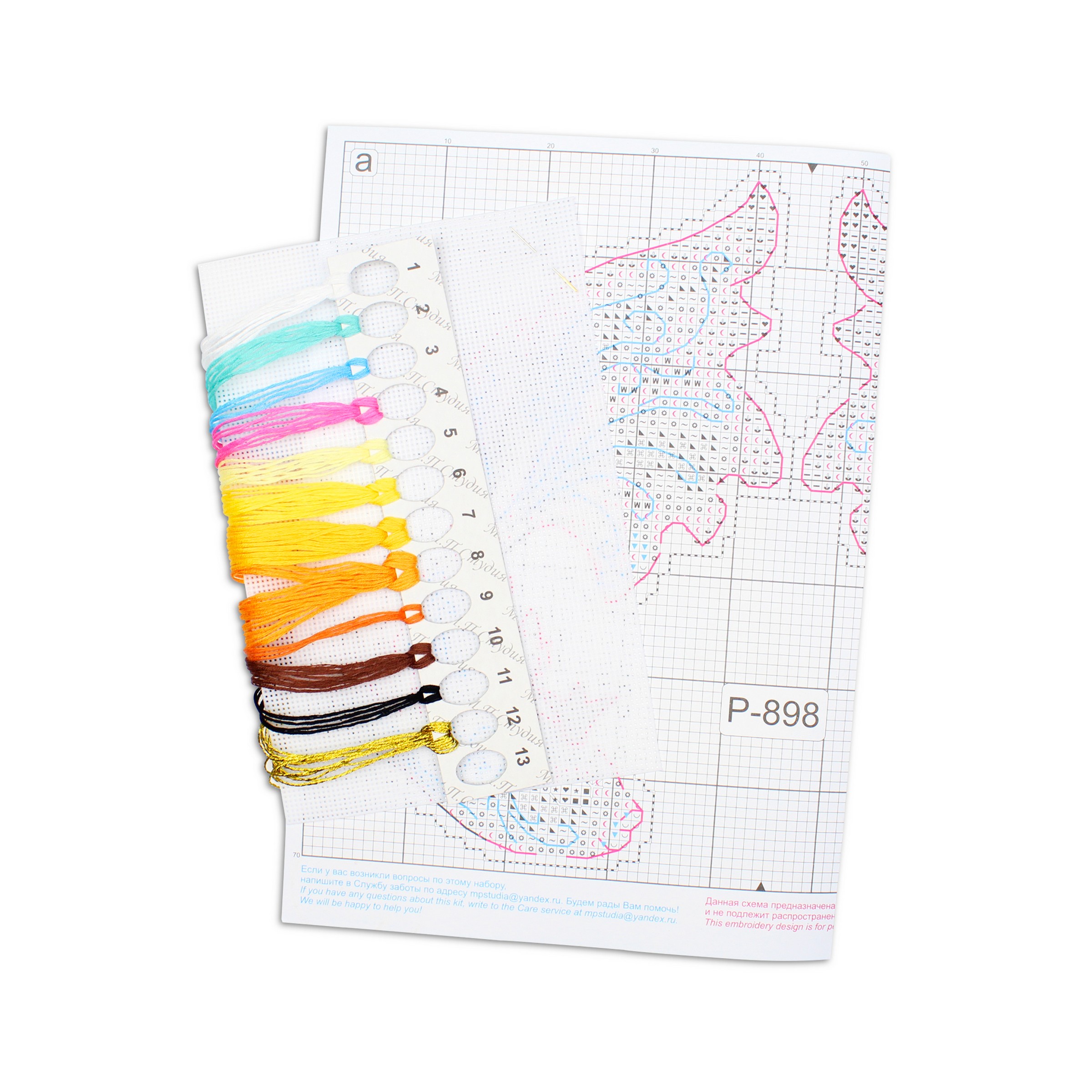 В состав набора входит: белая пластиковая канва 14 каунта, нитки мулине ПНК им.Кирова 11 цветов, разобранные на органайзере, нитки металлик 1 цвет, игла, схема бумажная и электронная Makosh, руководство по вышиванию.