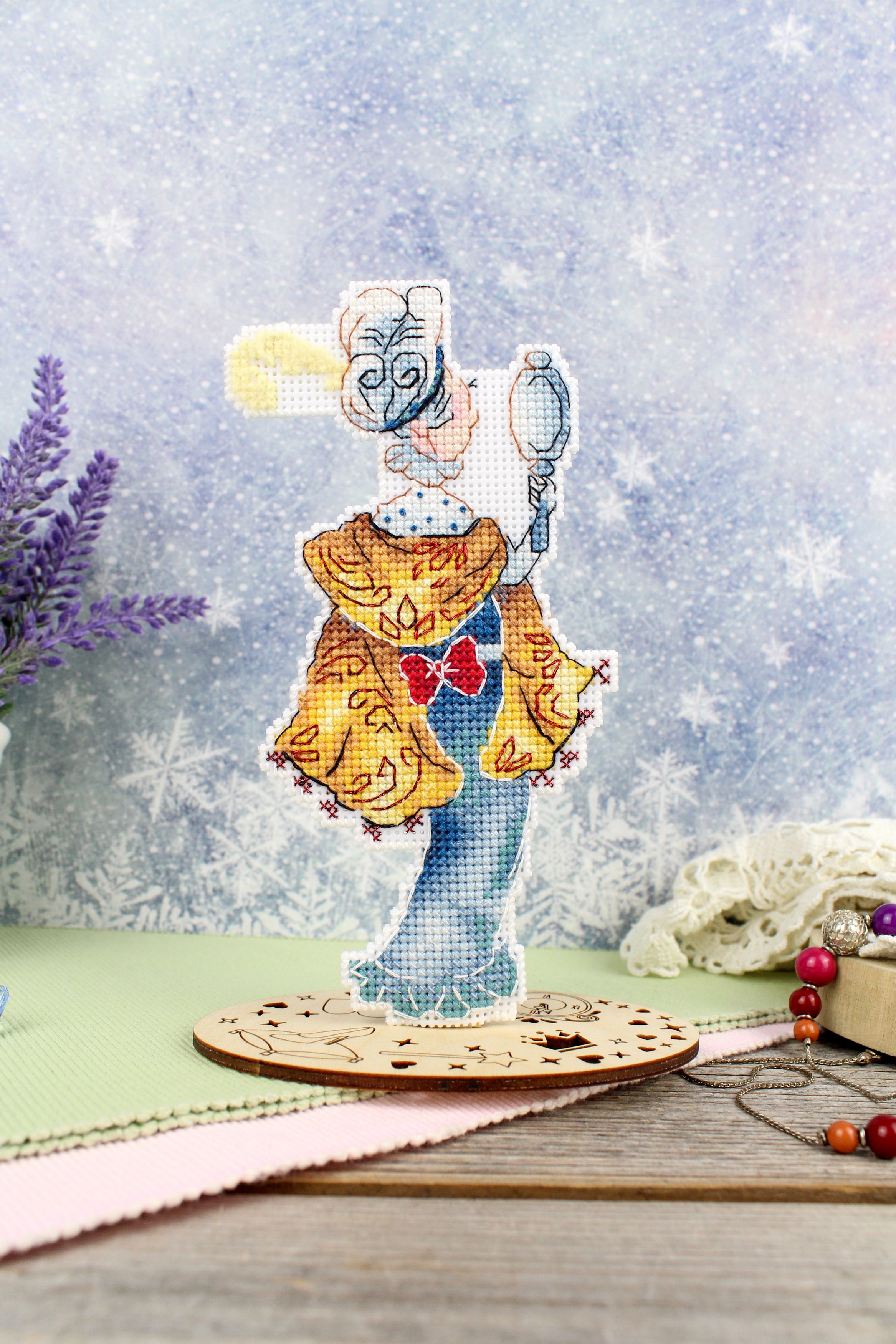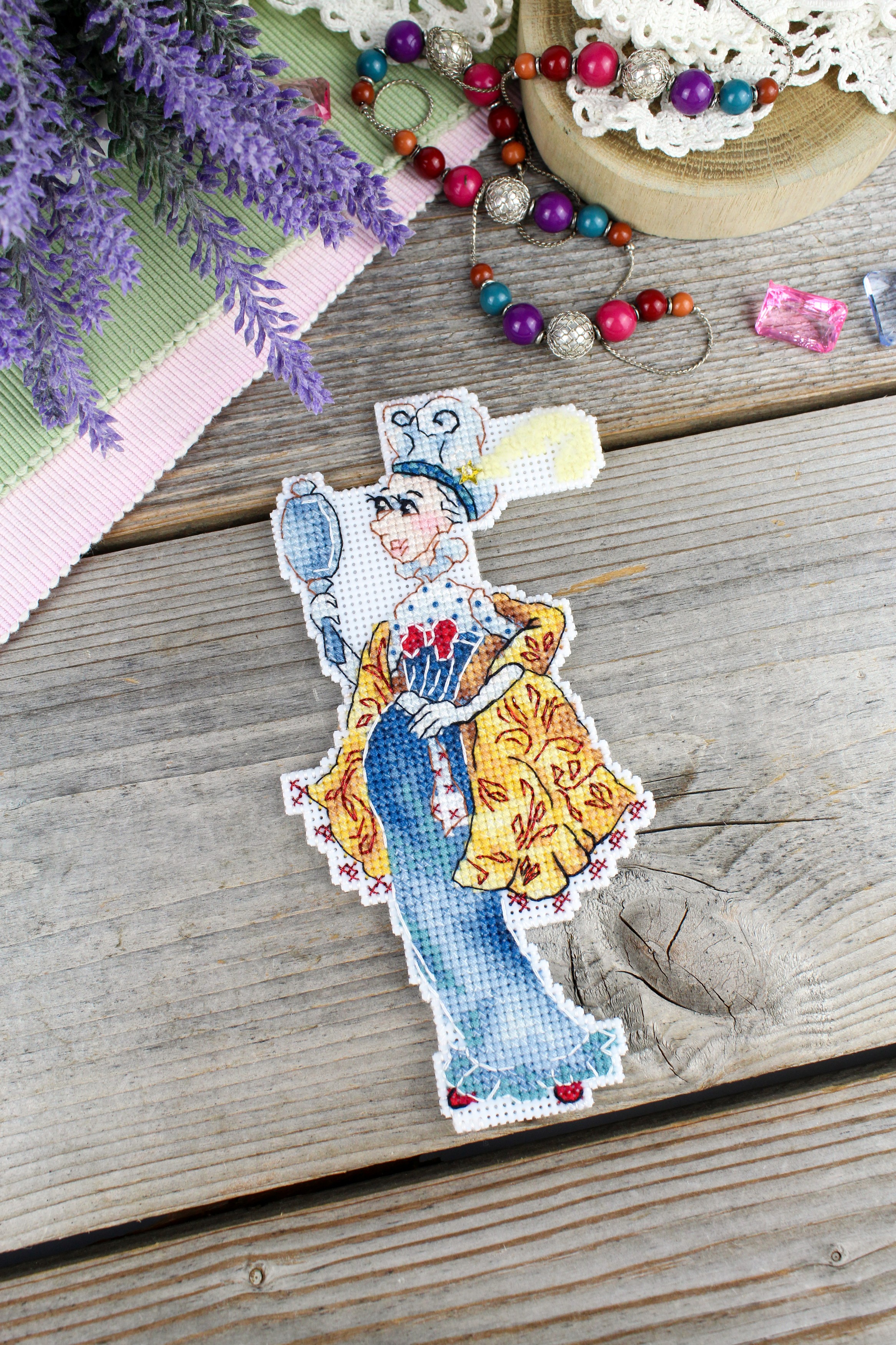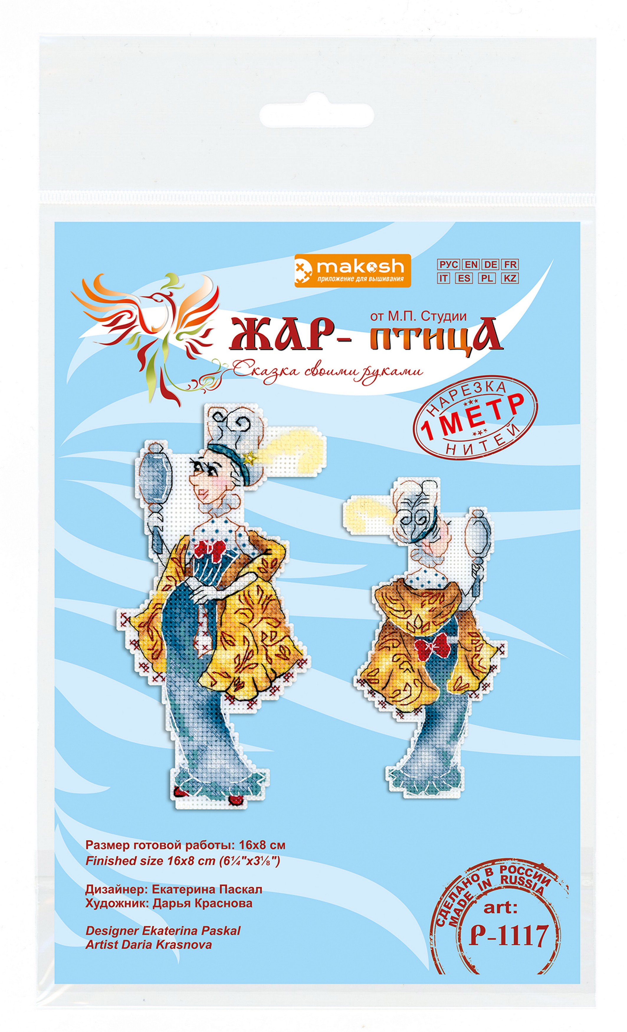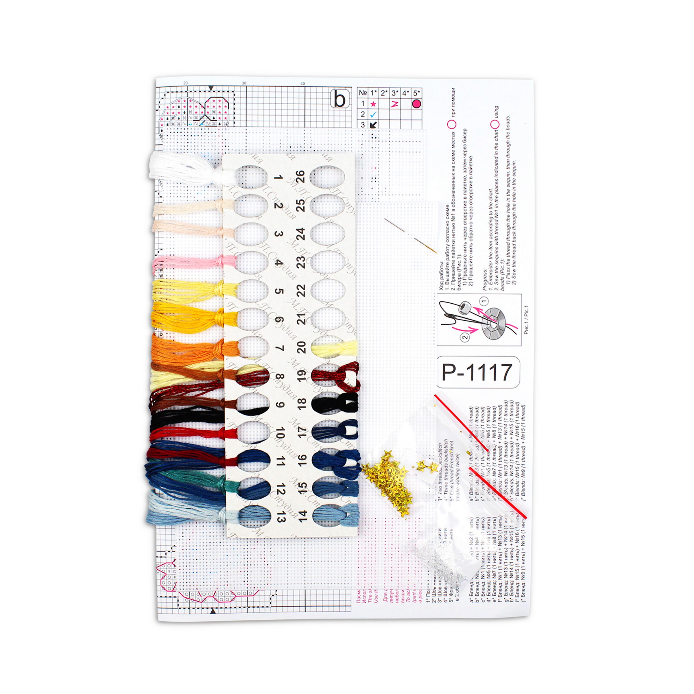 Размер 16х8 см. В состав набора входит: белая пластиковая канва 14 каунта, нитки мулине ПНК им.Кирова 18 цветов, разобранные на органайзере, нитки металлик - 1 цвет, нитки Gamma Cloud - 1 цвет, бисер - 1 цвет, пайетки - 1 цвет, игла, схема бумажная и электронная Makosh, руководство по вышиванию.