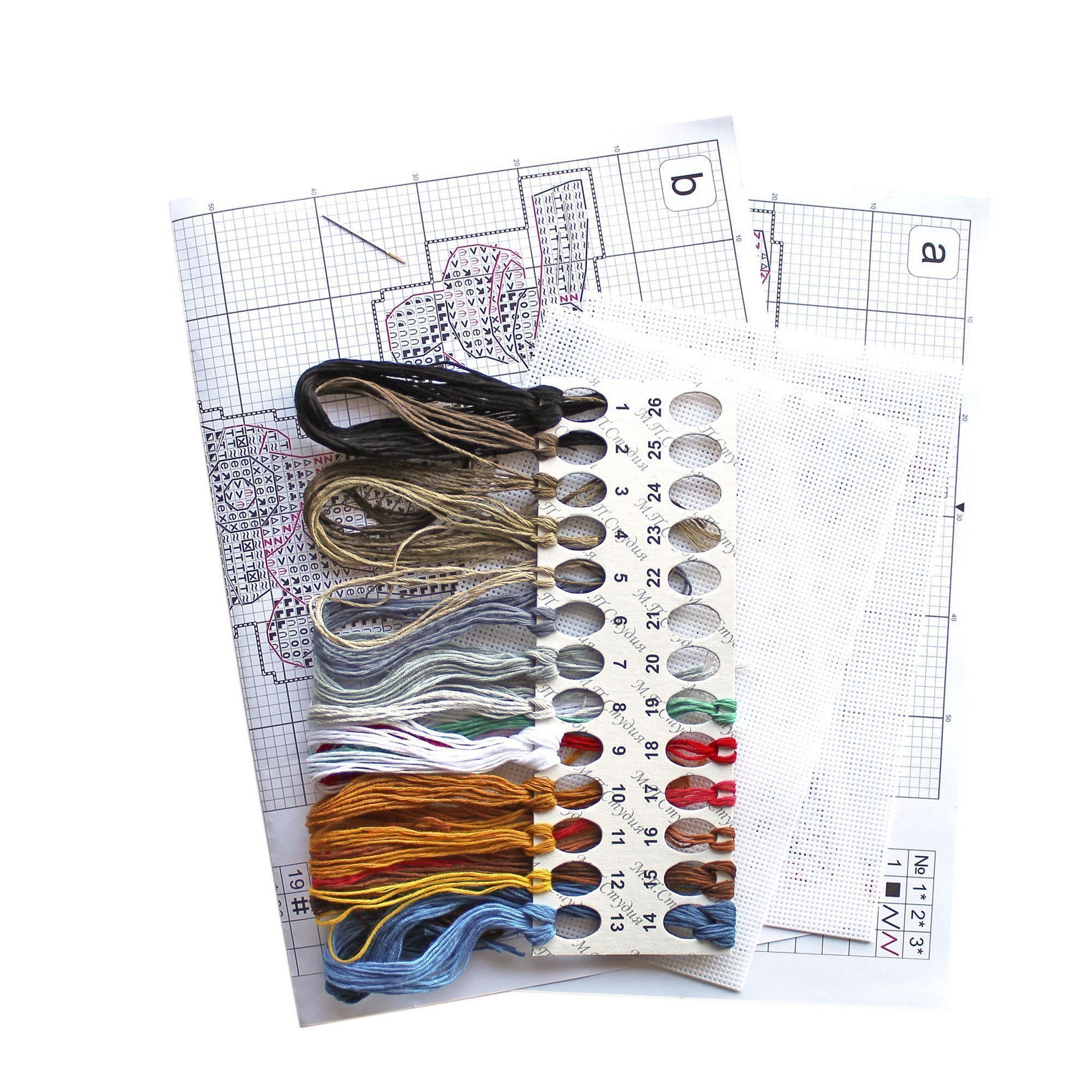Размер 20х10 см. В состав набора входит: пластиковая канва 14 каунта, нитки мулине ПНК им.Кирова 19 цветов, разобранные на органайзере, игла, схема и руководство по вышиванию.