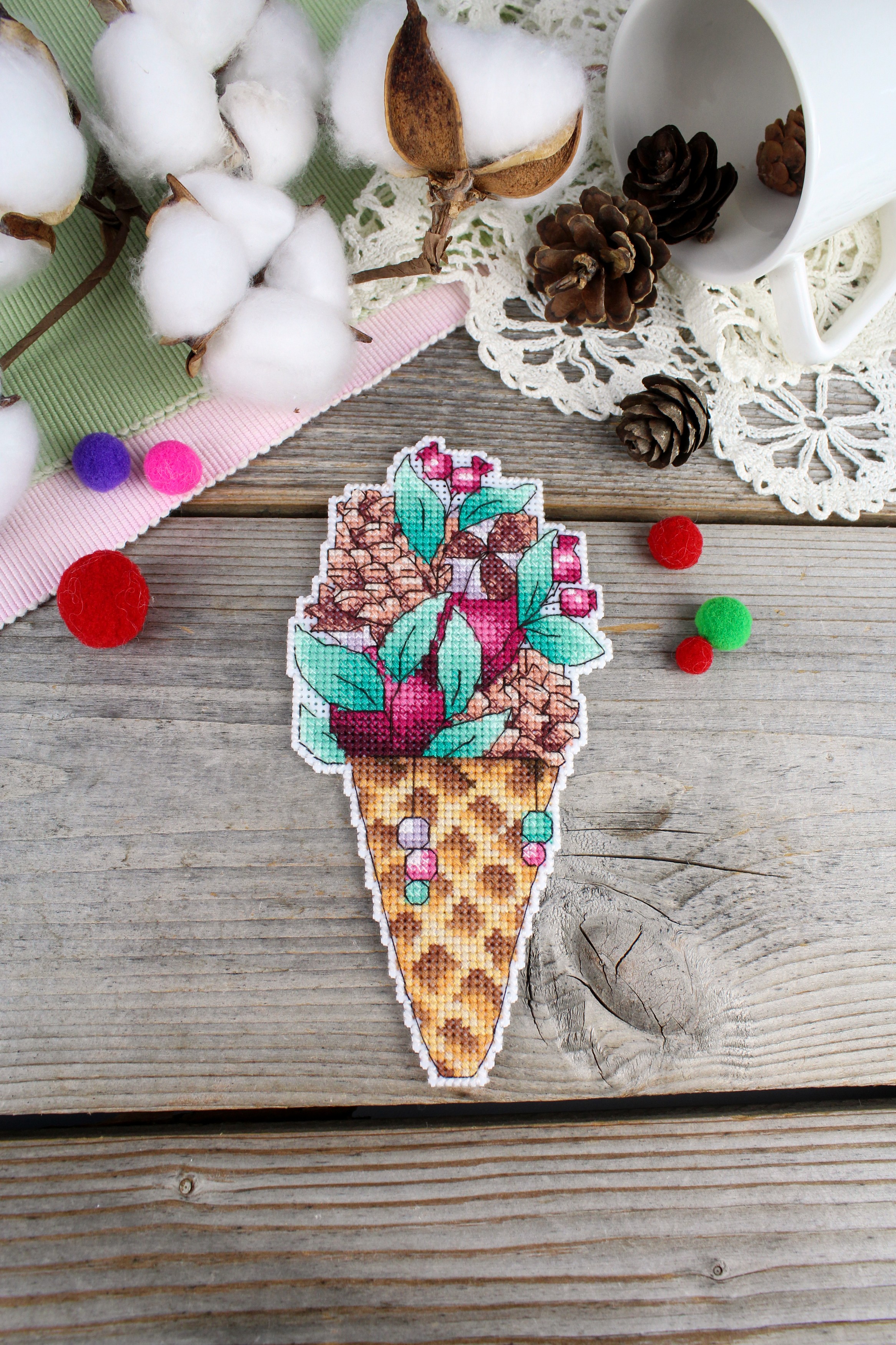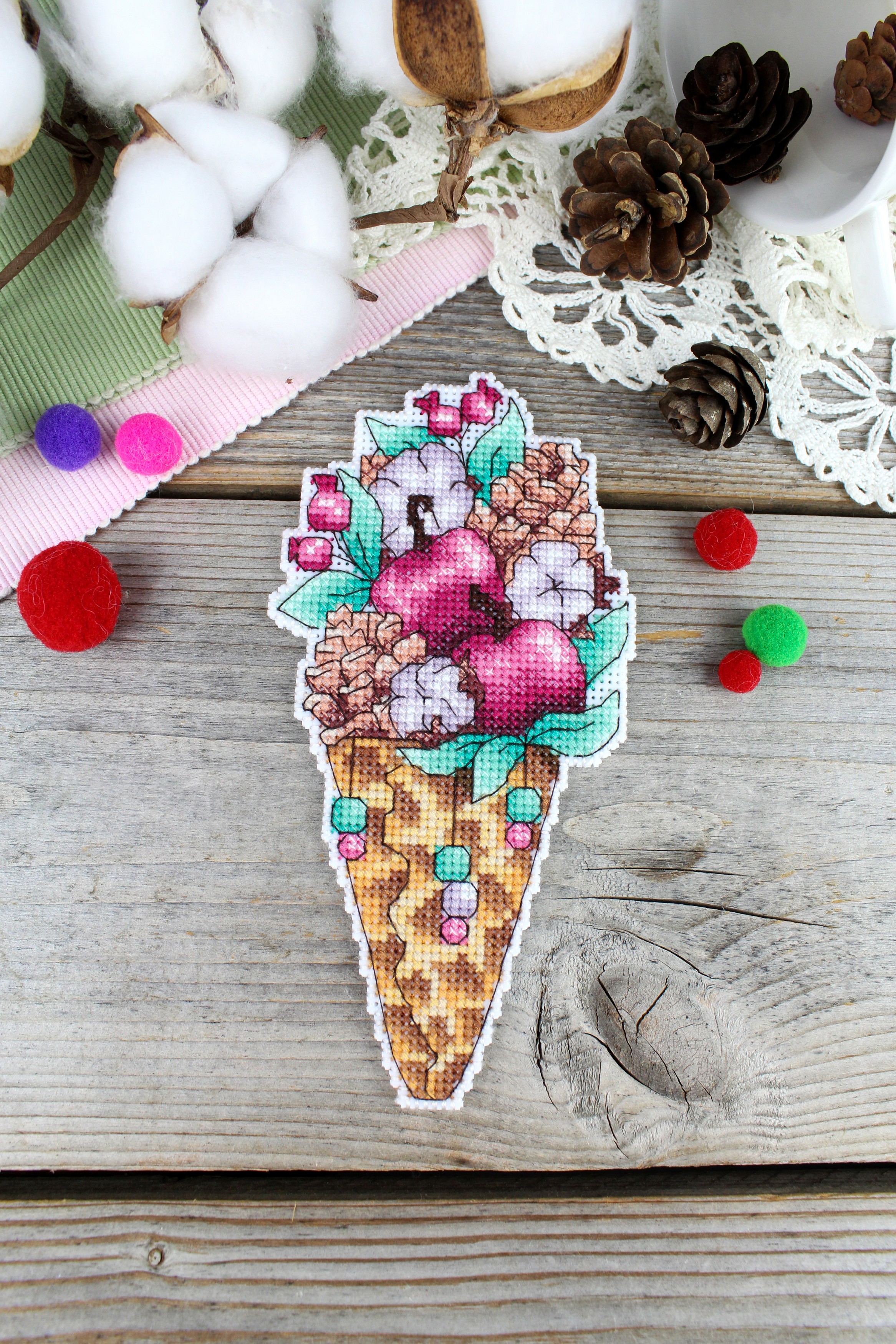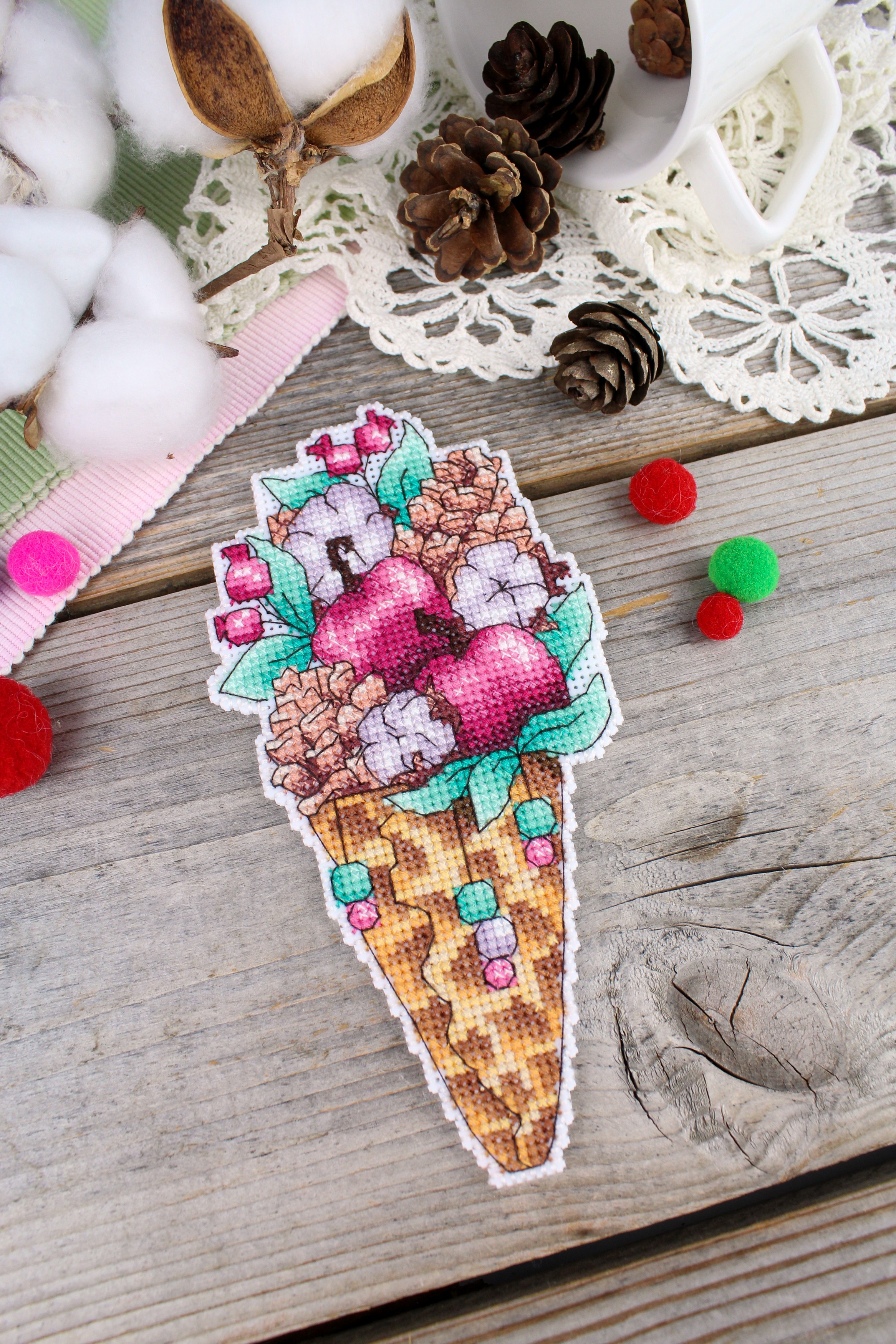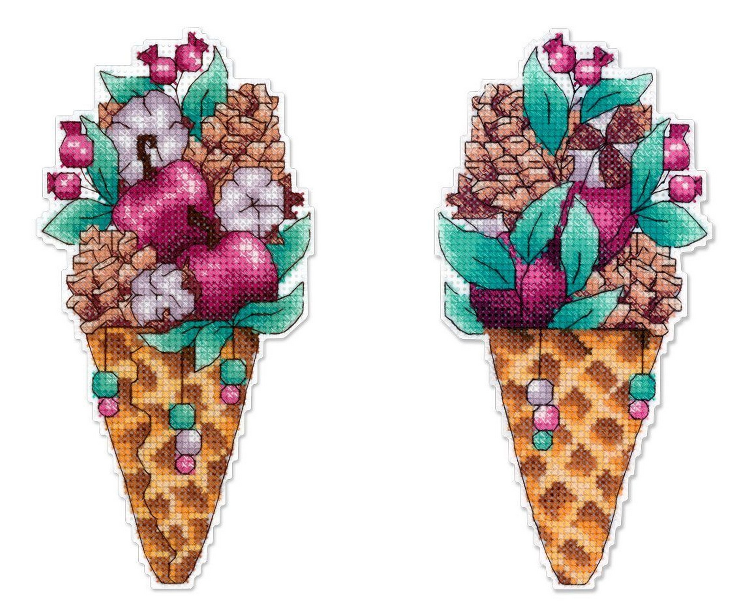 Обе стороны набора вышиваются согласно схеме, затем вырезаются по контуру, обозначенному в руководстве по вышиванию, и сшиваются изнаночными сторонами внутрь.