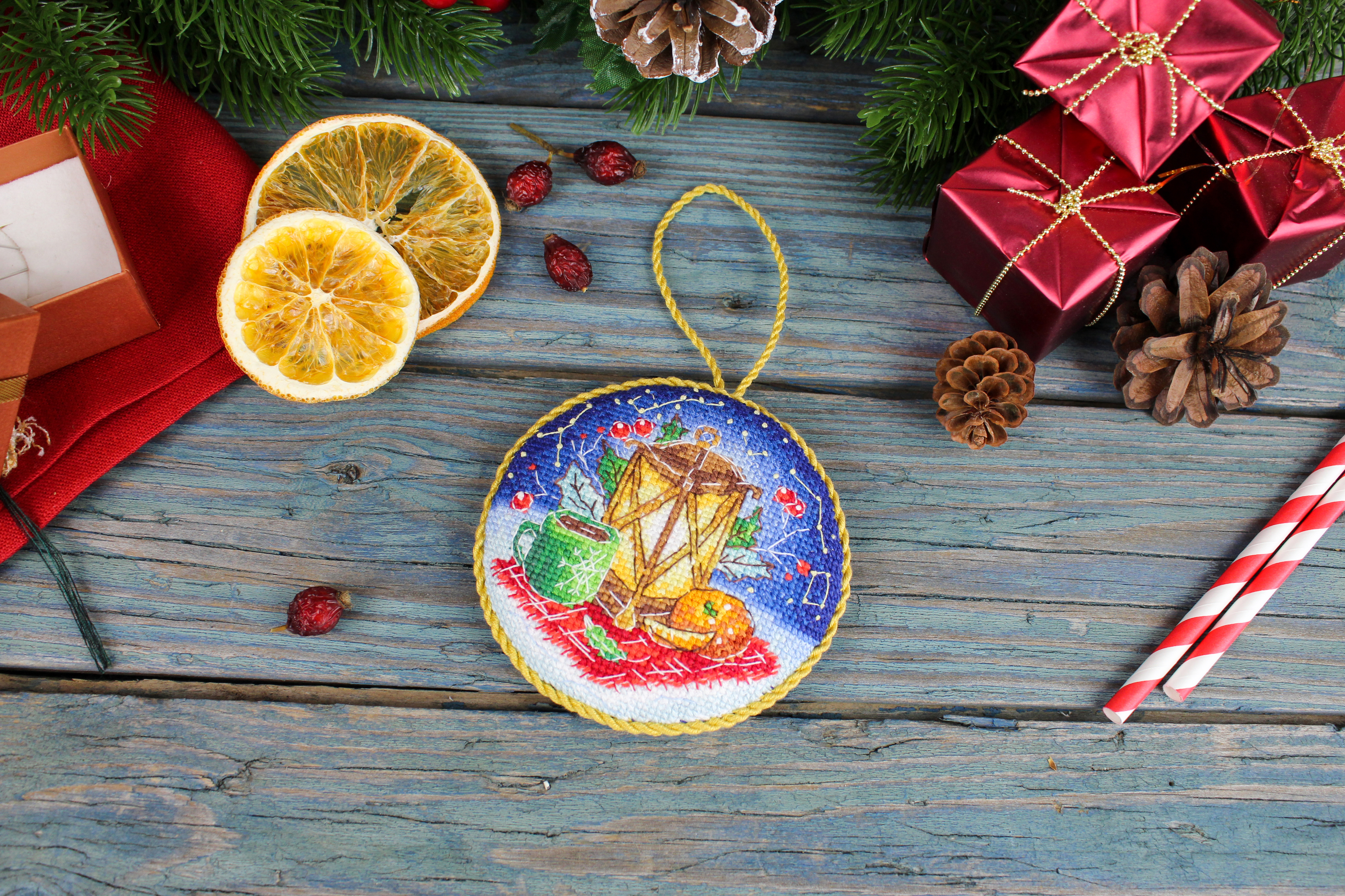 Полная зашивка. дополнительные элементы: Подарок, синтепон - 1 щтука, заготовка картонная - 1 штука, задний элемент синий цвет - 1 штука.