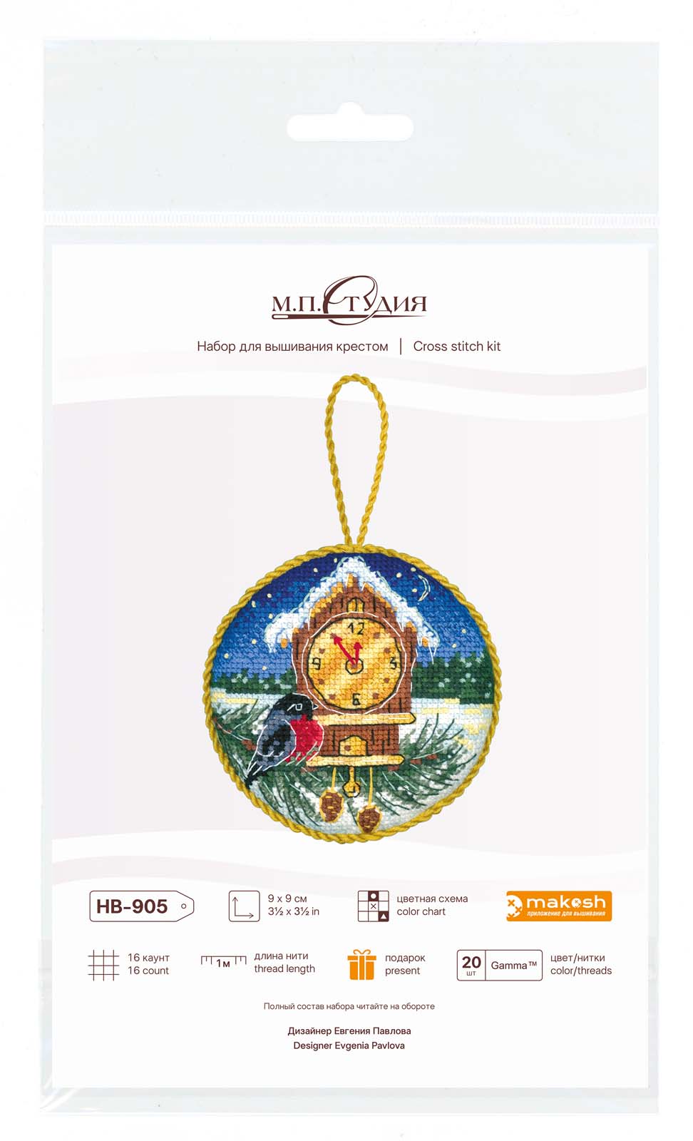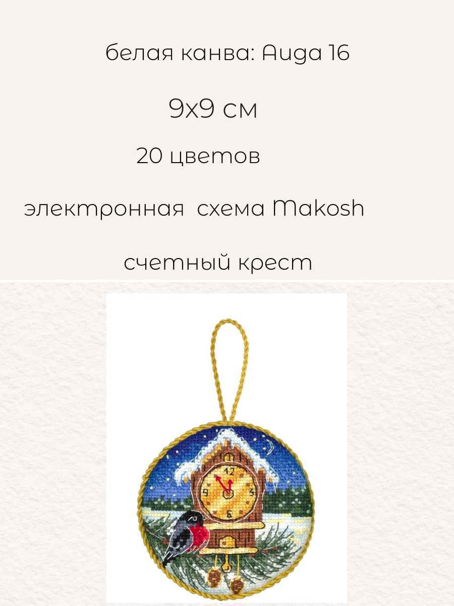 Размер: 9*9 см. В состав набора вышивки входит: белая хлопчатобумажная канва 16 каунта, нитки мулине Гамма 20 цветов, разобранные на органайзере, игла, бумажная цвето-символьная схема и электронная схема Makosh, вышивальная линейка, нитковдеватель, руководство по вышиванию. Техника вышивания: счетный крест.
