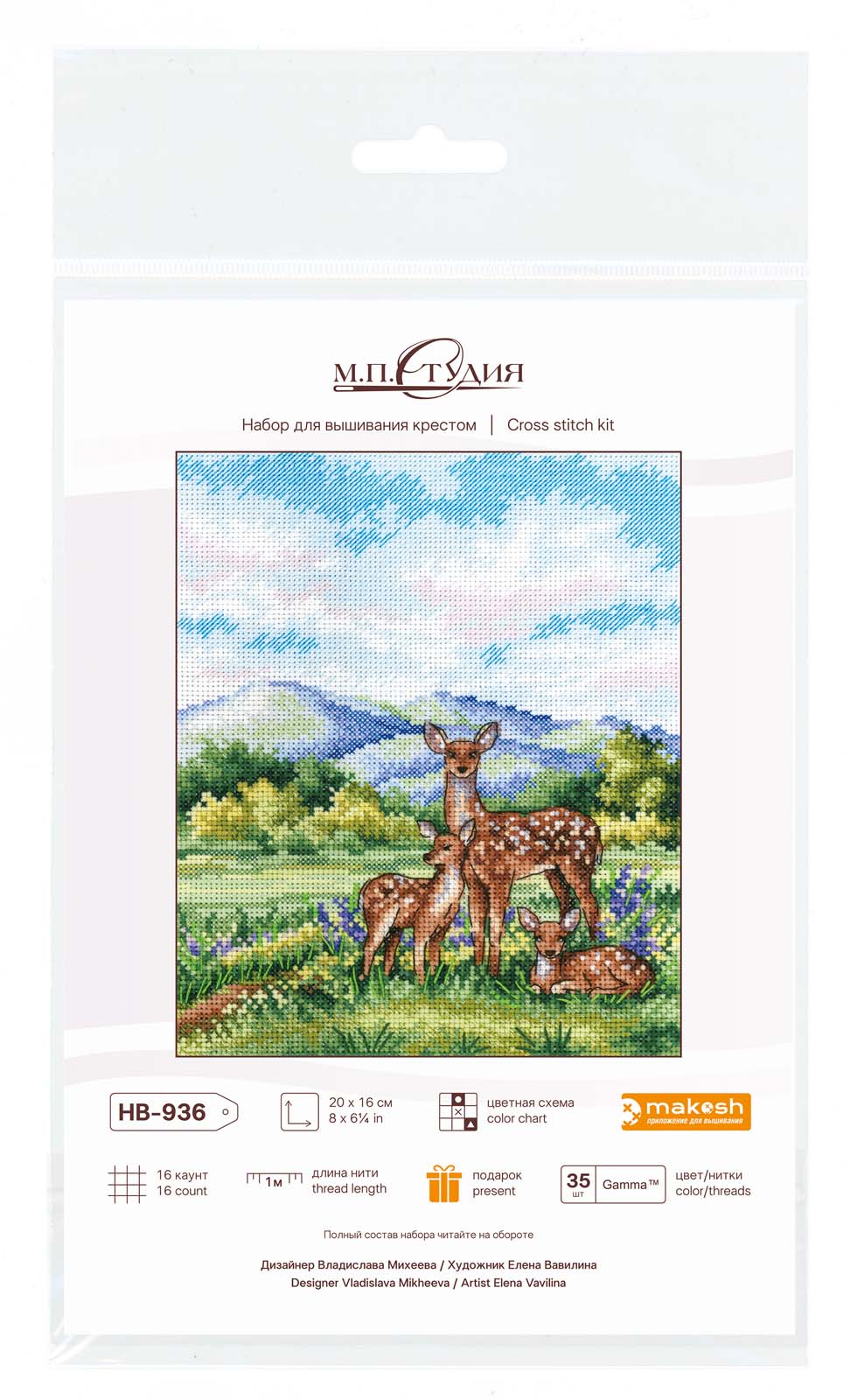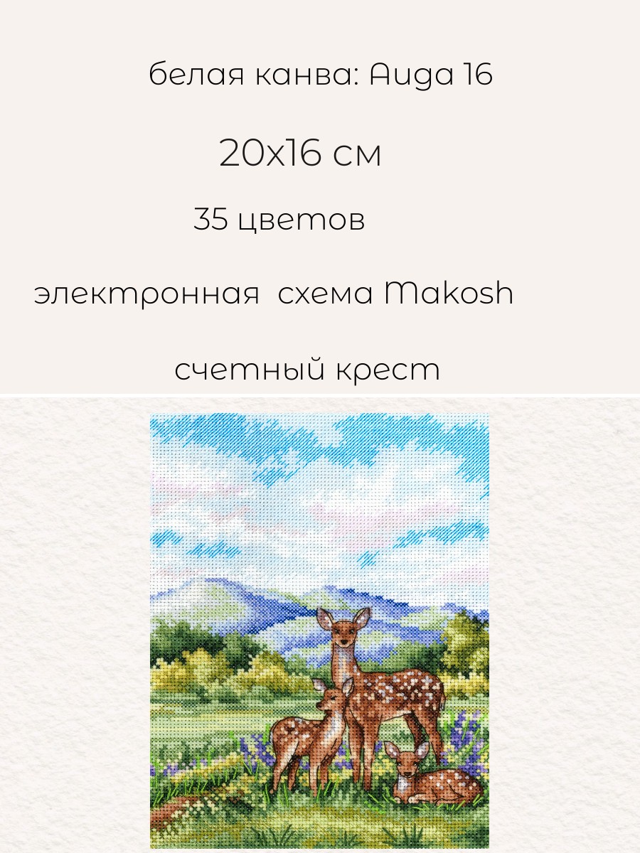 Размер: 20*16 см. В состав набора вышивки входит: белая хлопчатобумажная канва 16 каунта, нитки мулине Гамма 35 цветов, разобранные на органайзере, игла, бумажная цвето-символьная схема и электронная схема Makosh, вышивальная линейка, нитковдеватель, руководство по вышиванию. Техника вышивания: счетный крест.