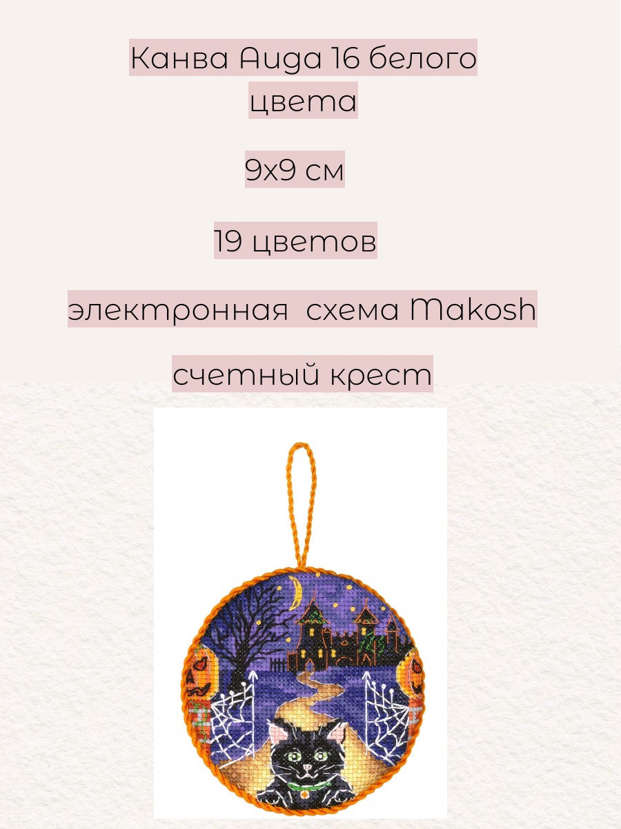 Размер: 9*9 см. В состав набора вышивки входит: белая хлопчатобумажная канва 16 каунта, нитки мулине Гамма 19 цветов, разобранные на органайзере, игла, бумажная цвето-символьная схема и электронная схема Makosh, вышивальная линейка, нитковдеватель, руководство по вышиванию. Техника вышивания: счетный крест.