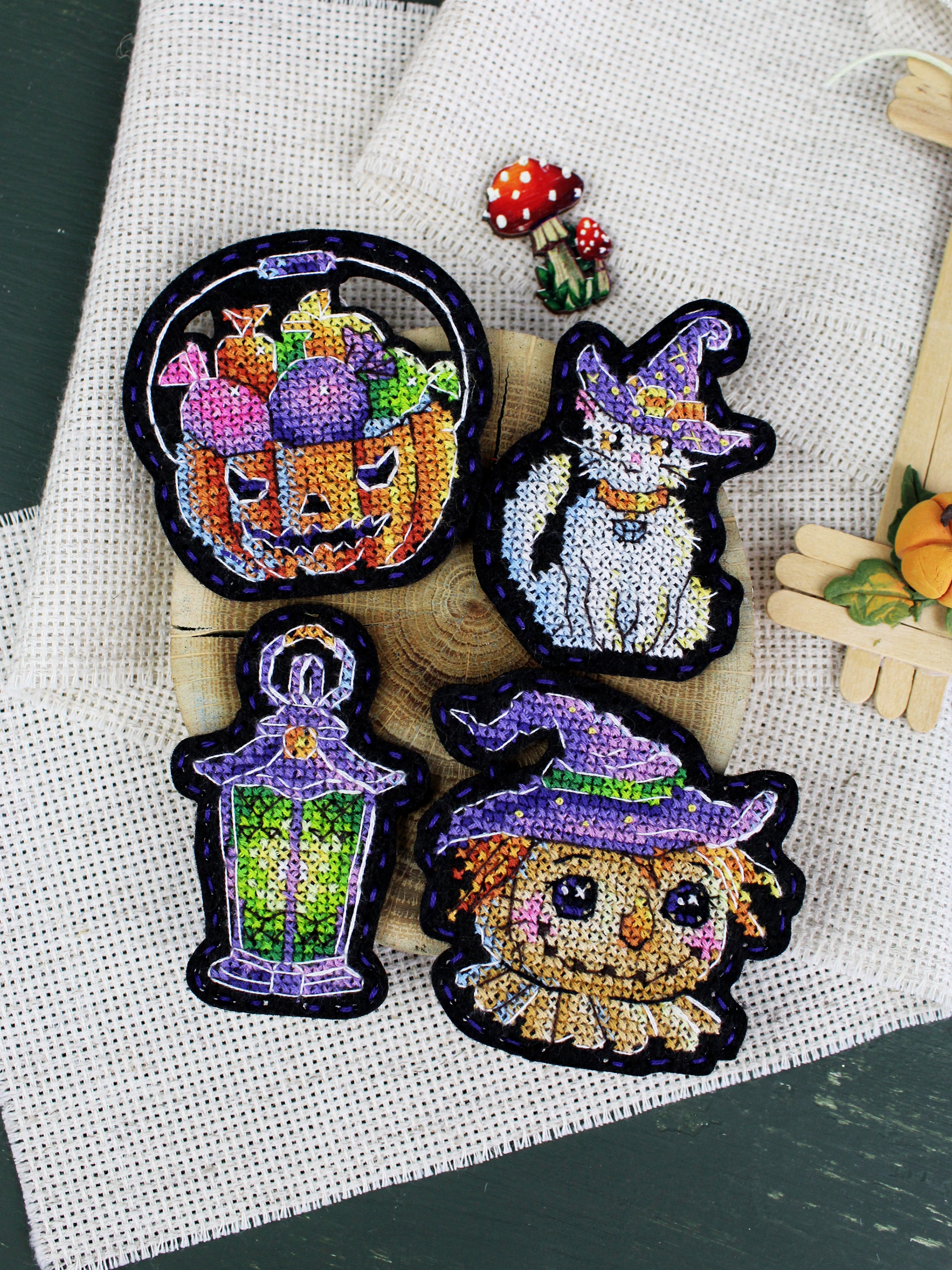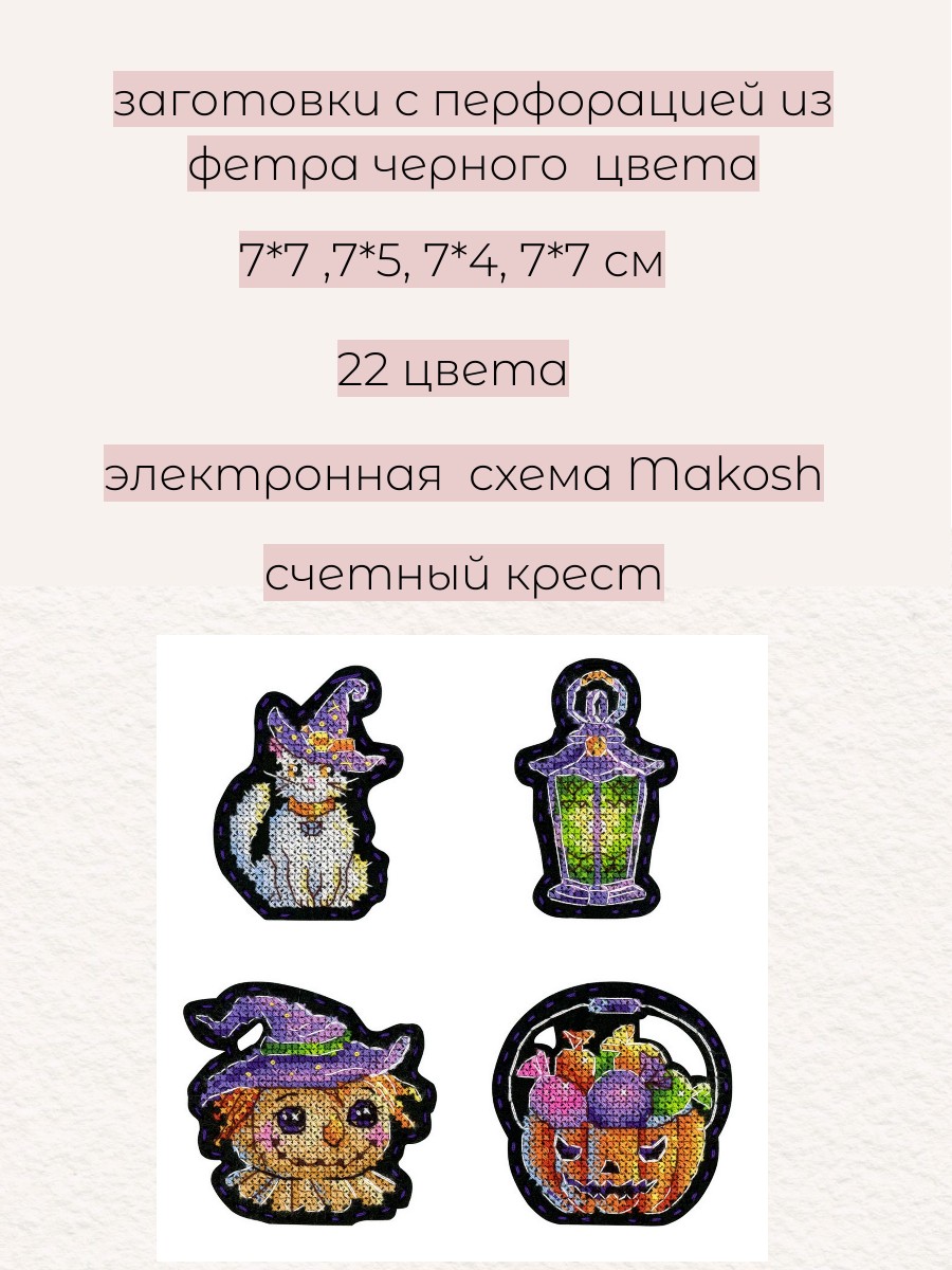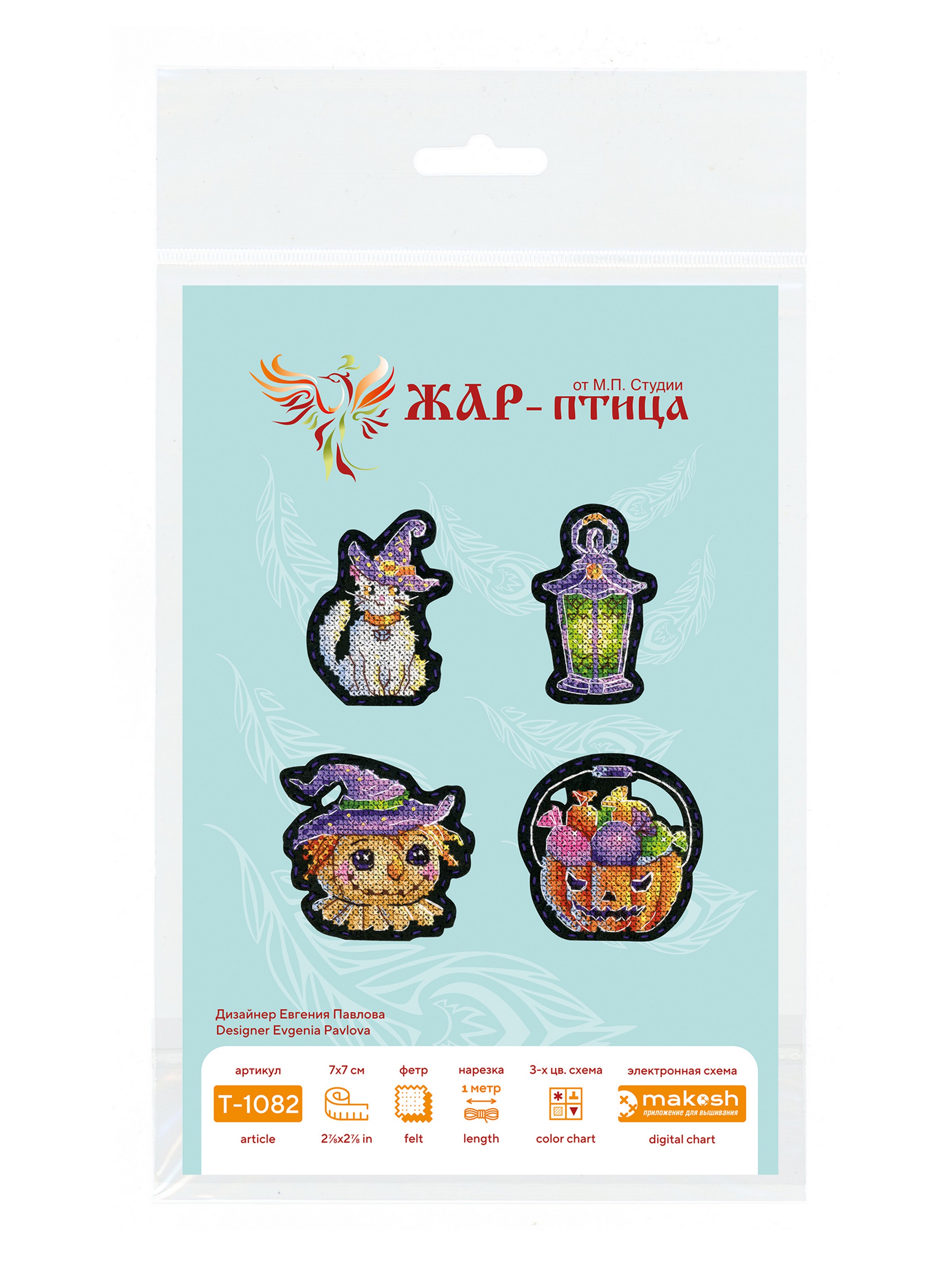 Представляем Ввшему вниманию набор для вышивания на фетре от ТМ Жар-птица, М.П. Студия, "Хэллоуинские топперы". Артикул: Т-1082. В состав набора входит: заготовки с перфорацией из фетра черного цвета, фетр для изнанки, нитки мулине ПНК им.Кирова 22 цвета, лента, игла, бумажная схема и электронная Makosh, руководство по вышиванию. Техника вышивания: счетный крест. Размер 7х7, 7х5, 7х4, 7х7 см.