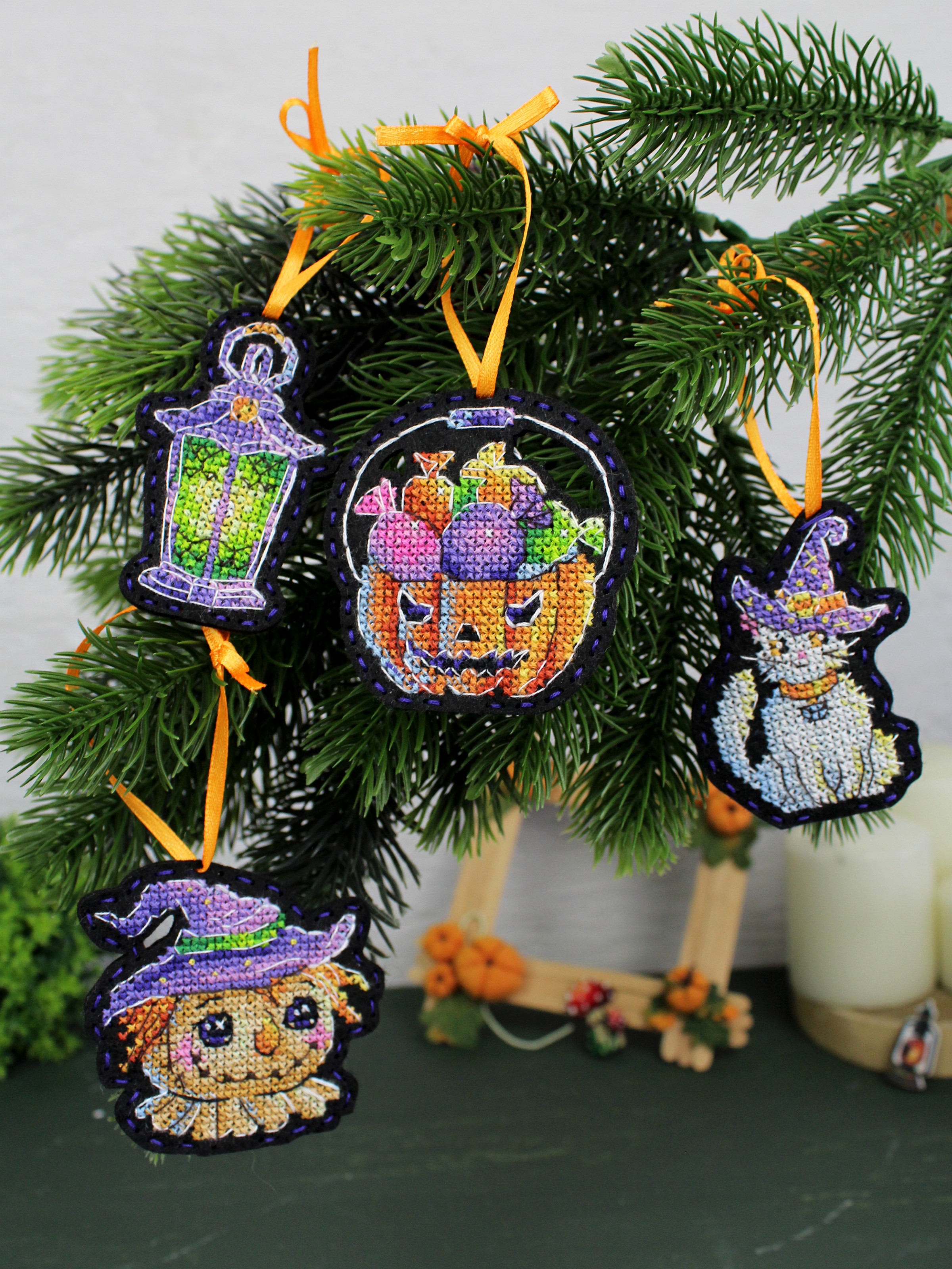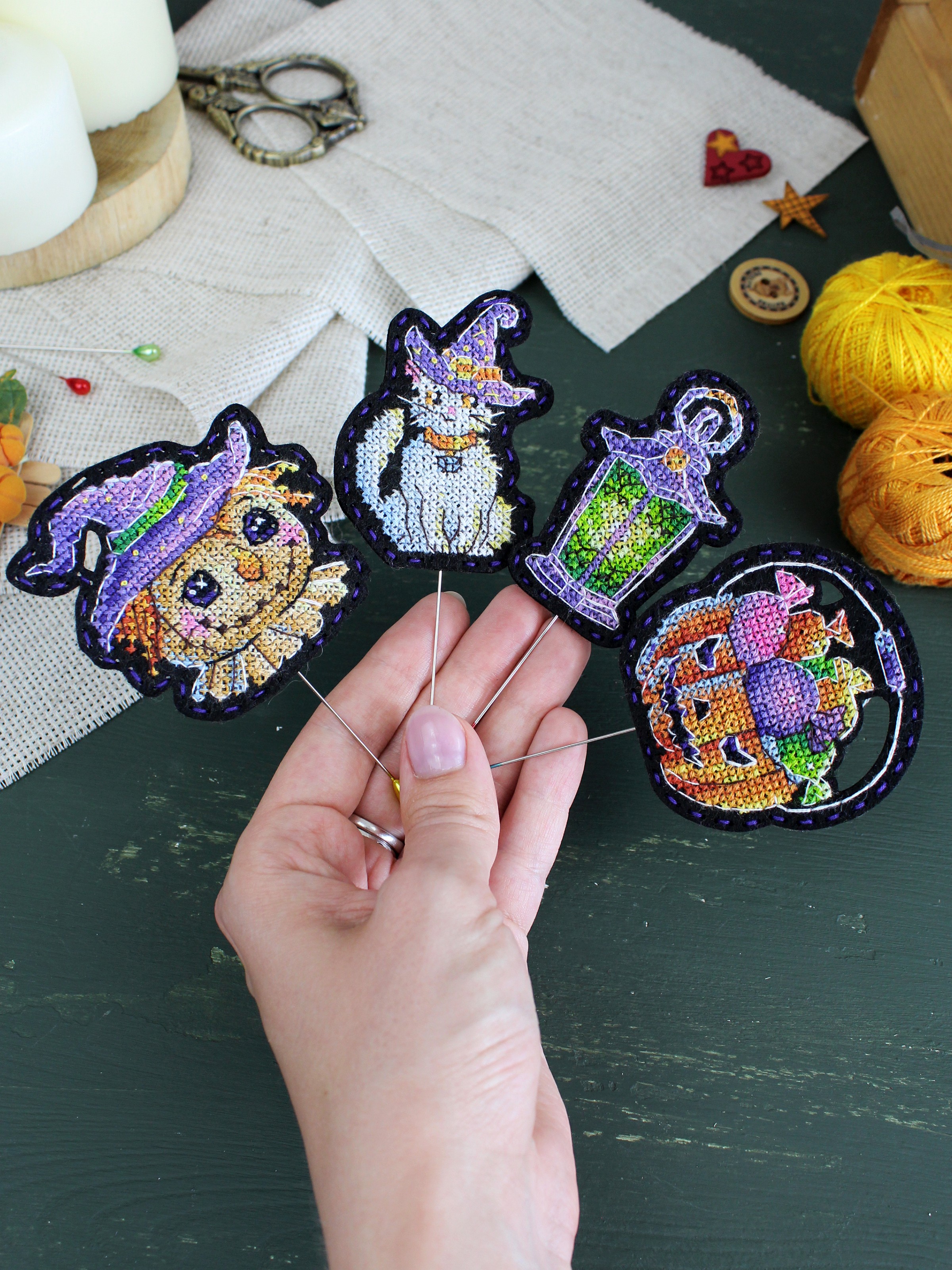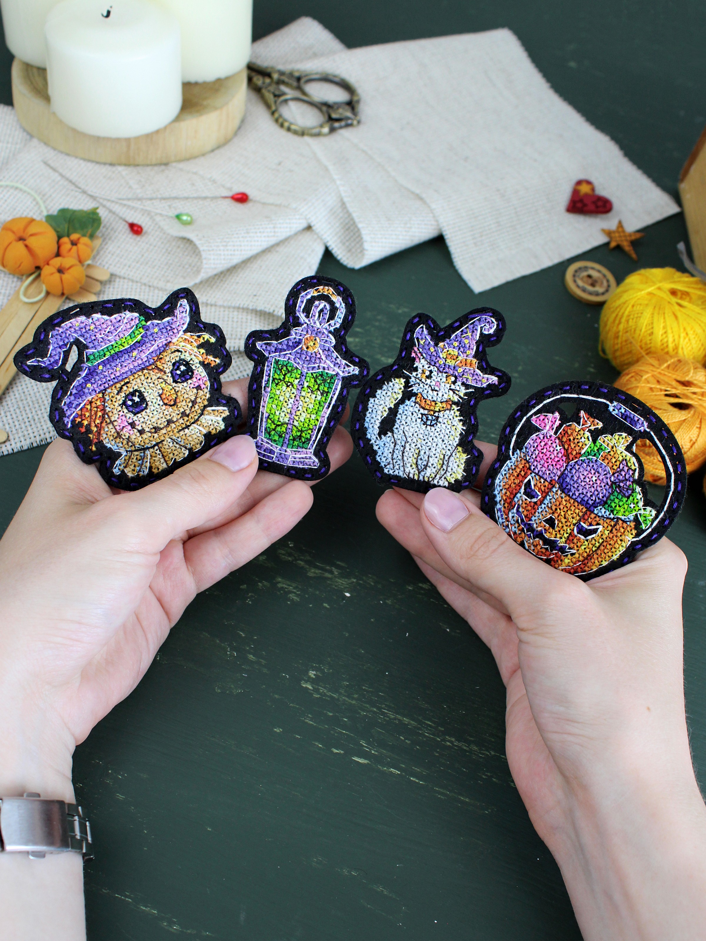 Представляем Ввшему вниманию набор для вышивания на фетре от ТМ Жар-птица, М.П. Студия, "Хэллоуинские топперы". Артикул: Т-1082. В состав набора входит: заготовки с перфорацией из фетра черного цвета, фетр для изнанки, нитки мулине ПНК им.Кирова 22 цвета, лента, игла, бумажная схема и электронная Makosh, руководство по вышиванию. Техника вышивания: счетный крест. Размер 7х7, 7х5, 7х4, 7х7 см.