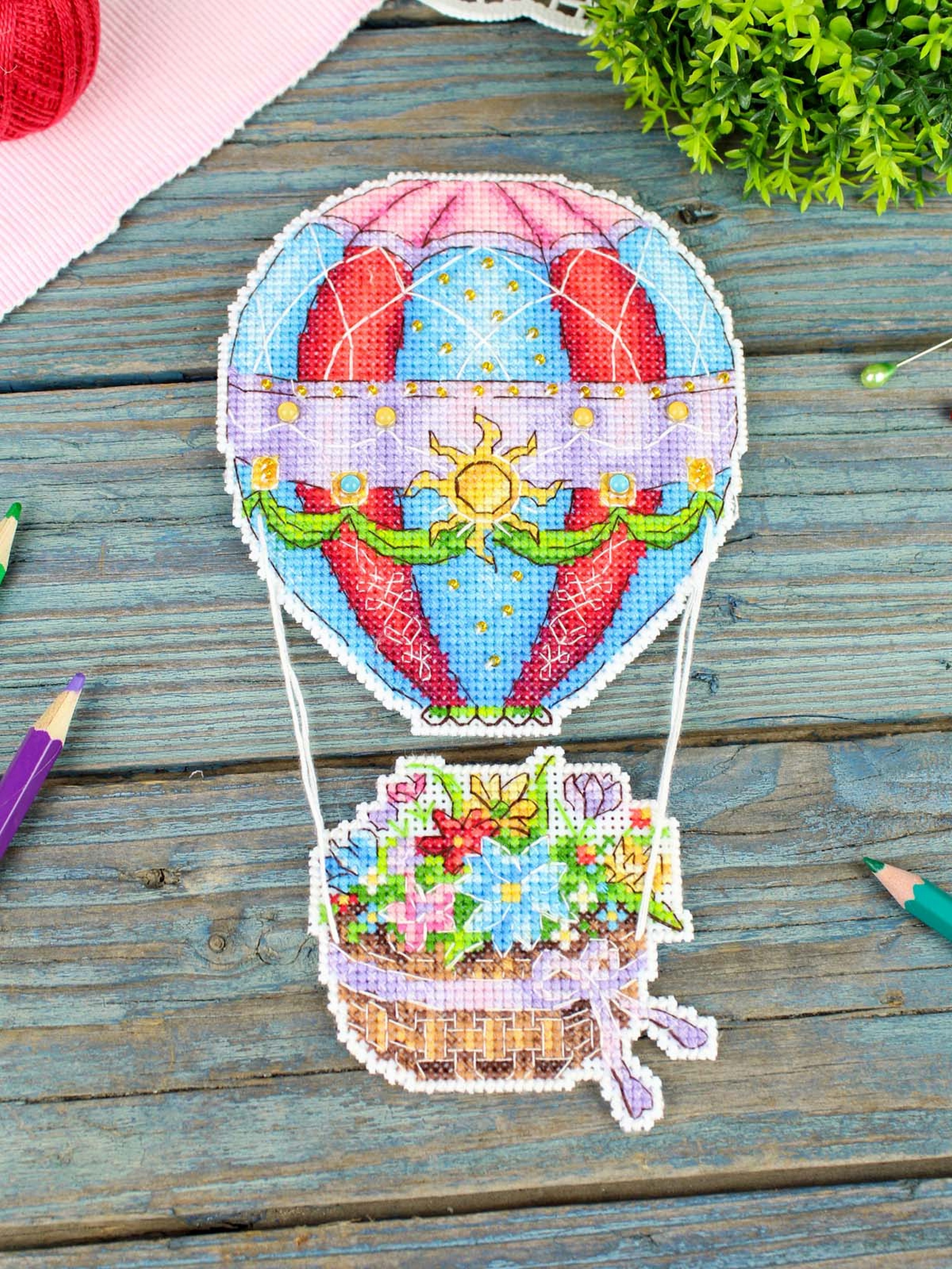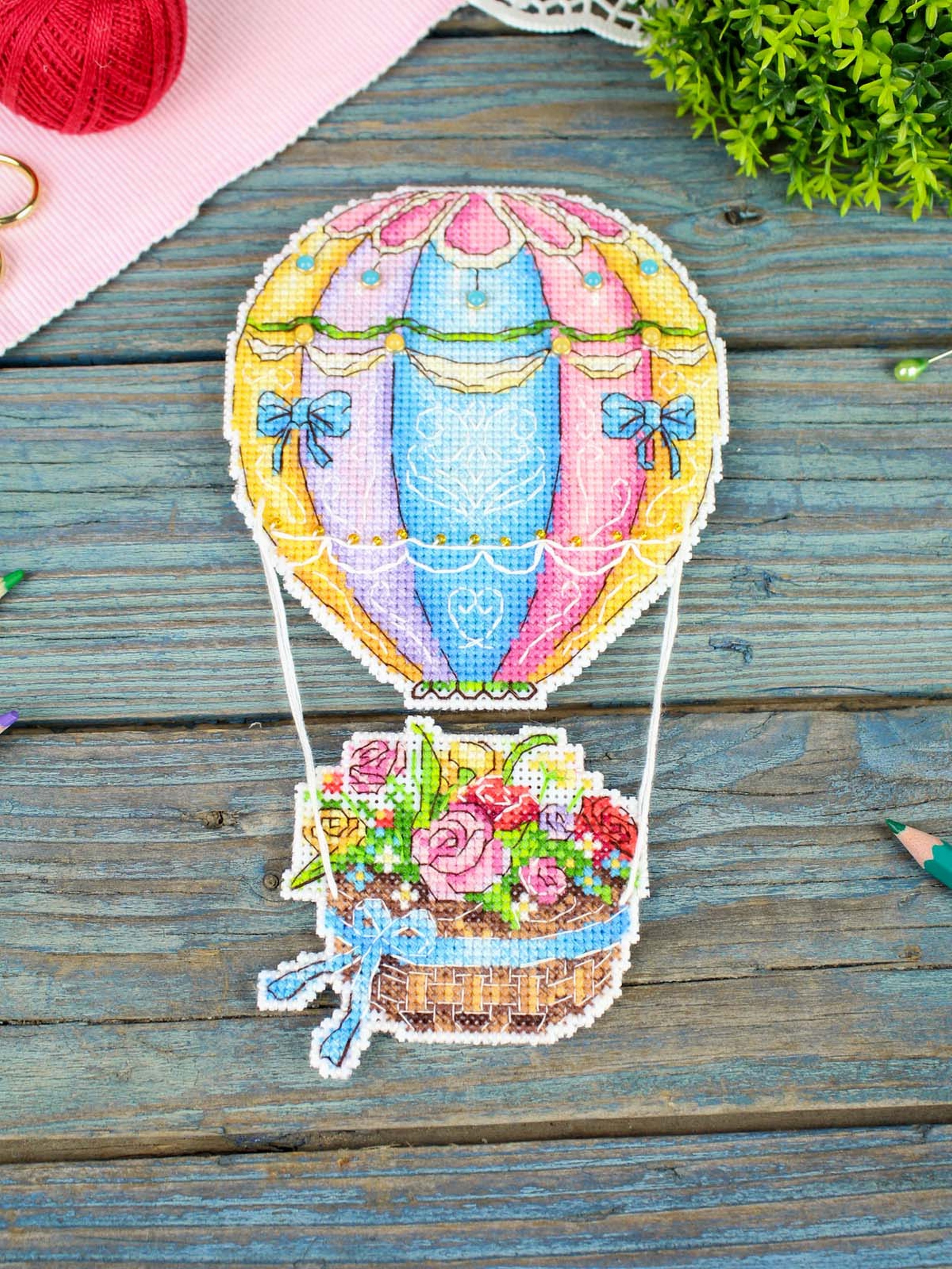 Обе стороны набора вышиваются согласно схеме, затем вырезаются по контуру, обозначенному в руководстве по вышиванию, и сшиваются изнаночными сторонами внутрь.