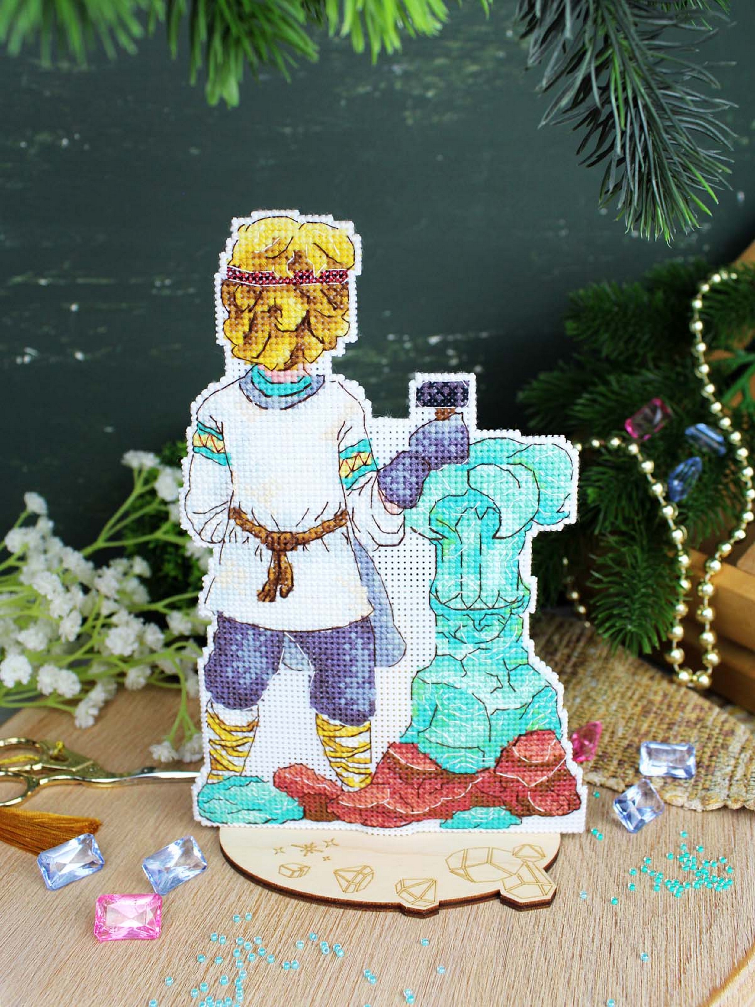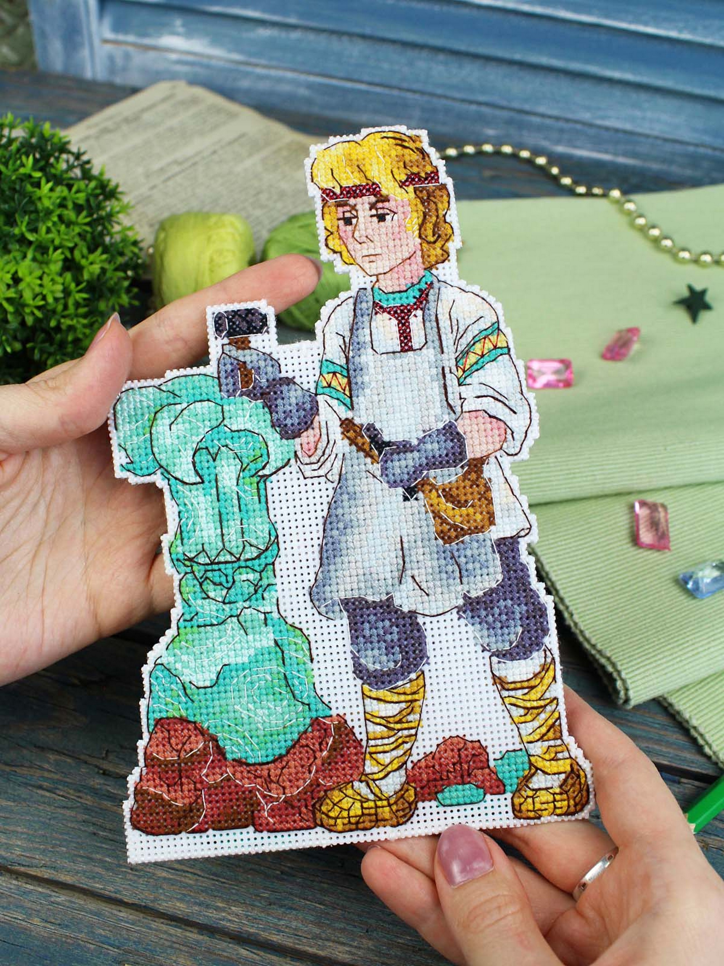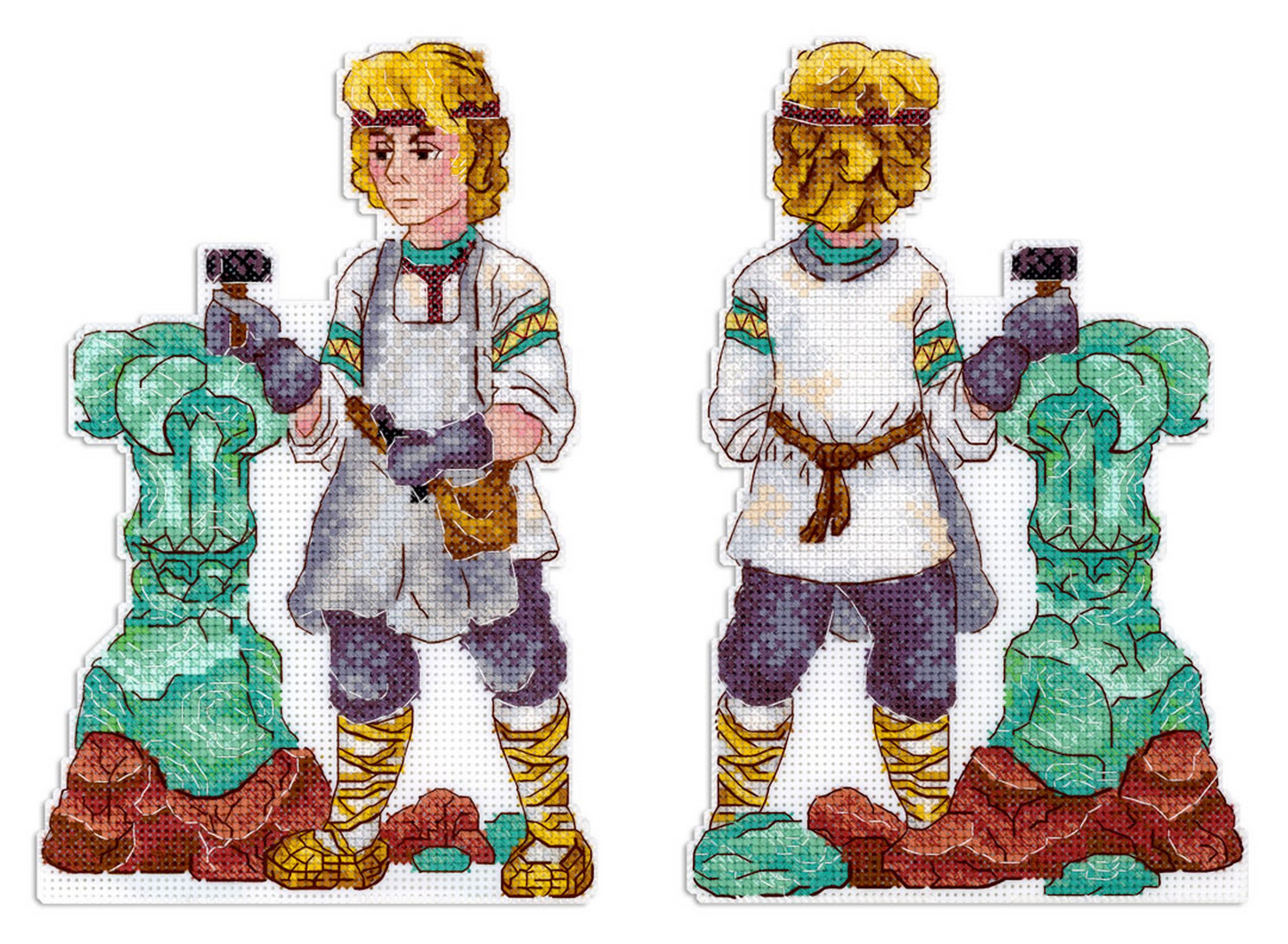 Обе стороны набора вышиваются согласно схеме, затем вырезаются по контуру, обозначенному в руководстве по вышиванию, и сшиваются изнаночными сторонами внутрь.