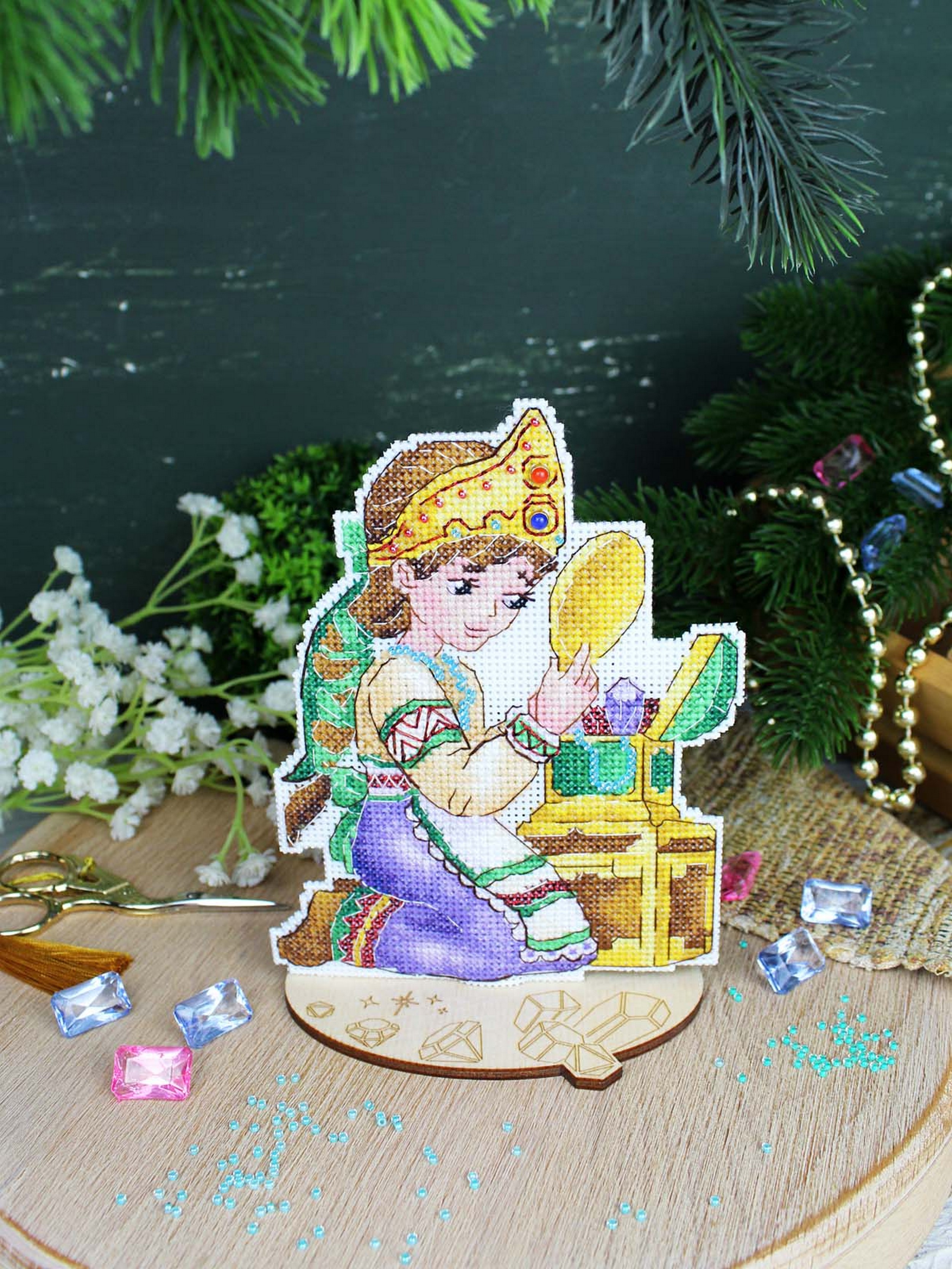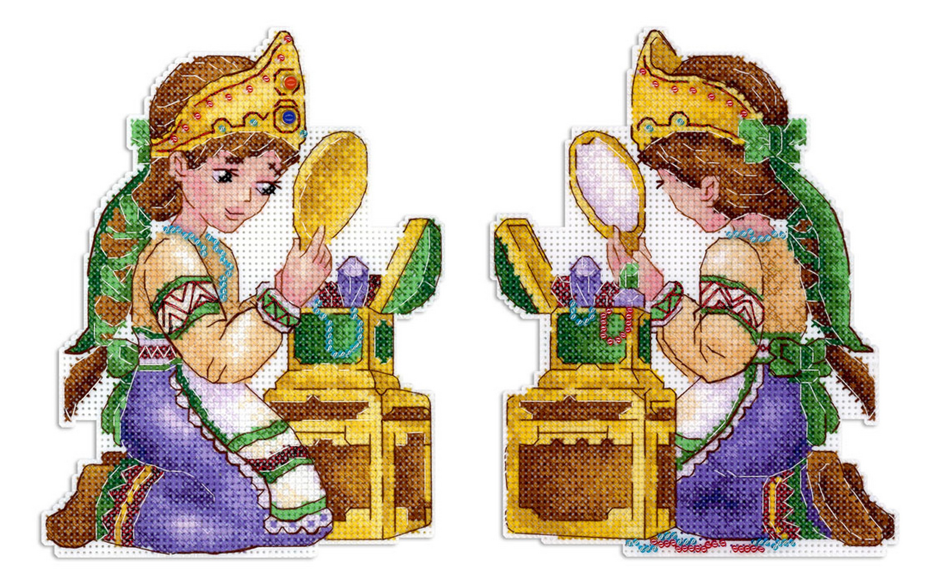 Обе стороны набора вышиваются согласно схеме, затем вырезаются по контуру, обозначенному в руководстве по вышиванию, и сшиваются изнаночными сторонами внутрь.
