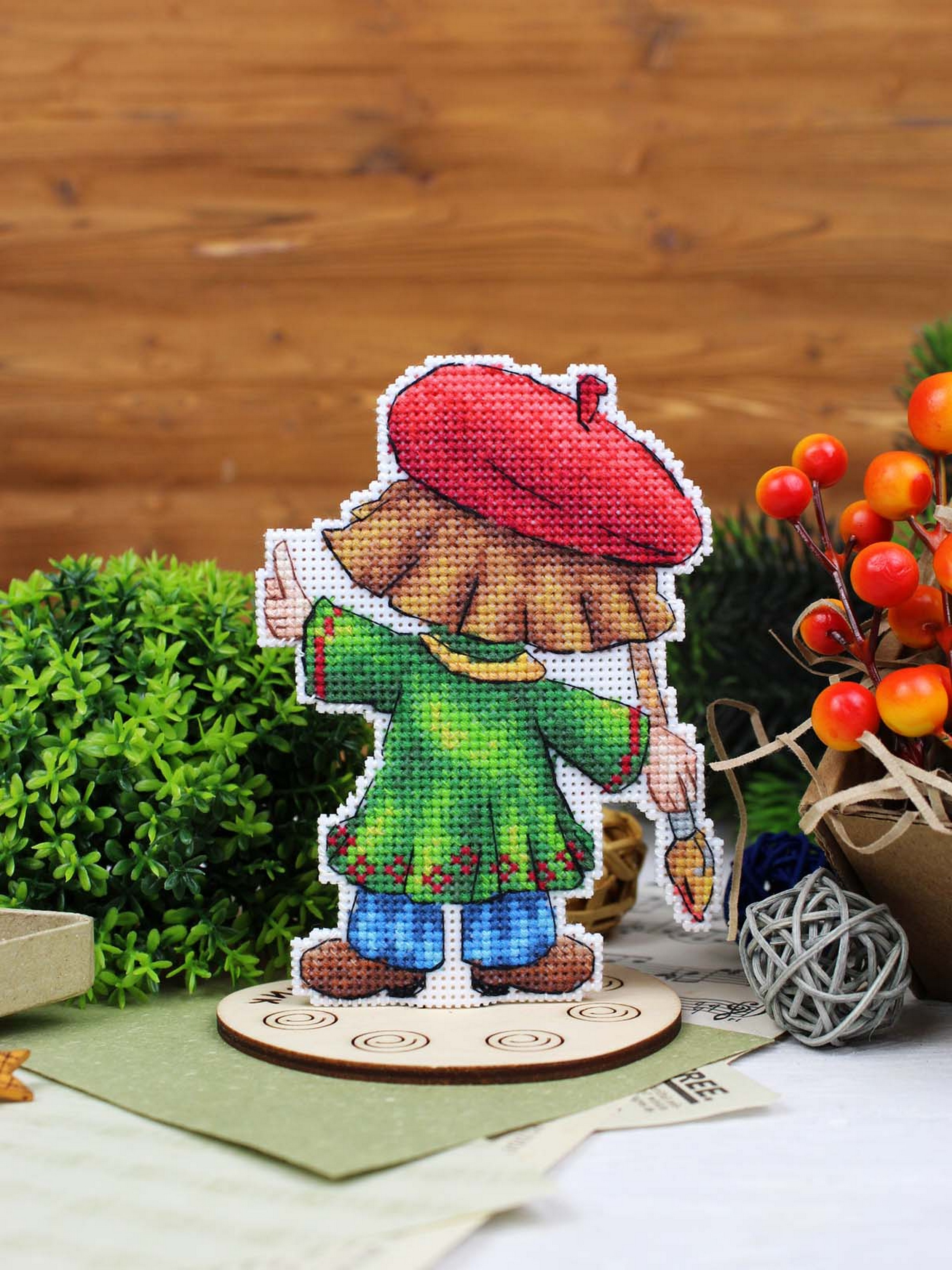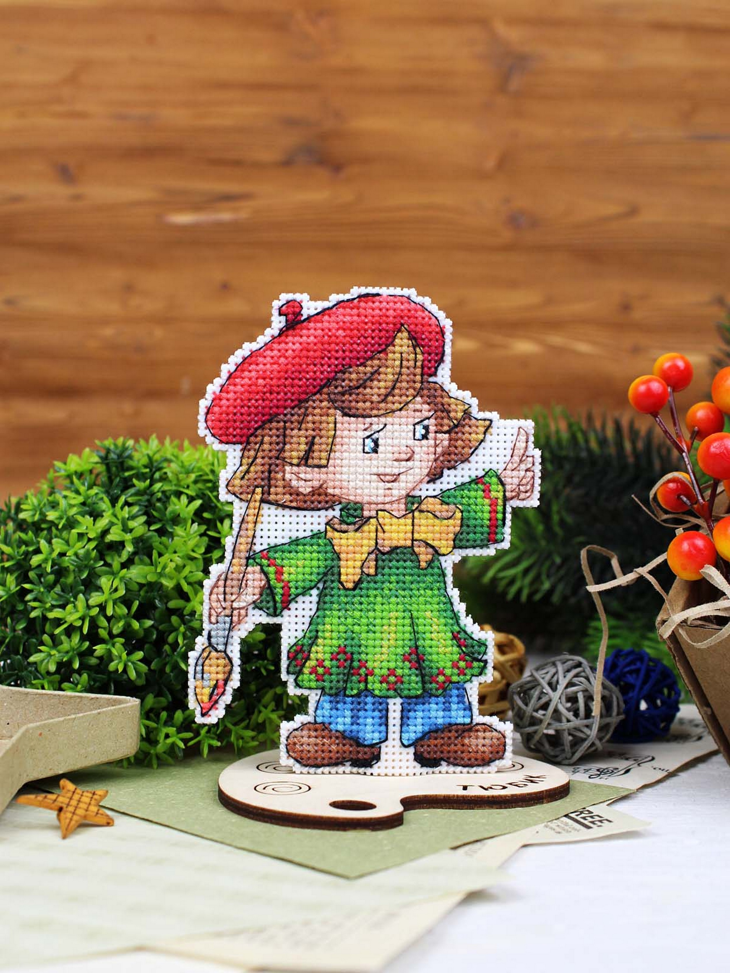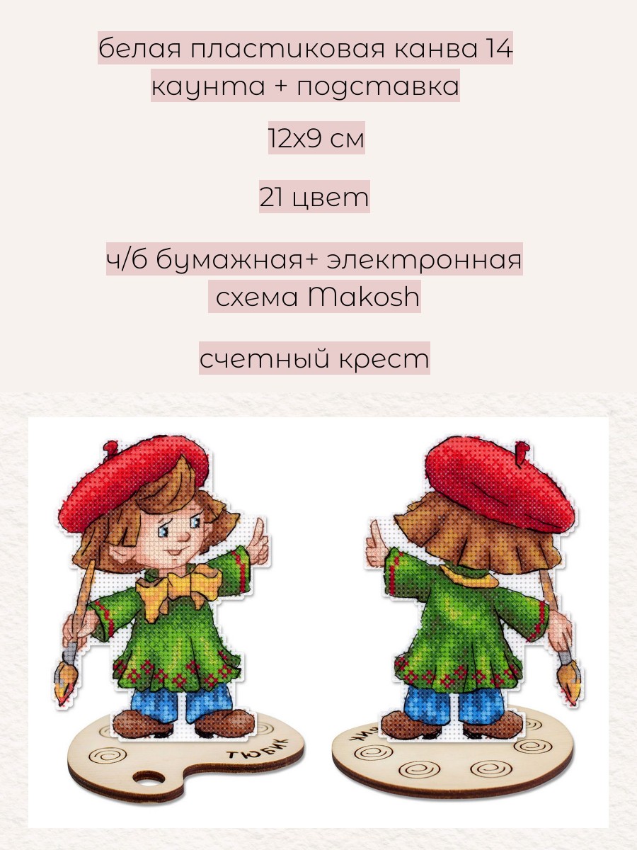 Размер 12х9 см. В состав набора вышивки входит: белая пластиковая канва 14 каунта, нитки мулине ПНК им.Кирова 21 цвет, разобранные на органайзере, игла, схема бумажная и электронная Makosh, руководство по вышиванию. Техника вышивания: счетный коест. Полная зашивка. Дополнительные элементы: деревянная подставка.