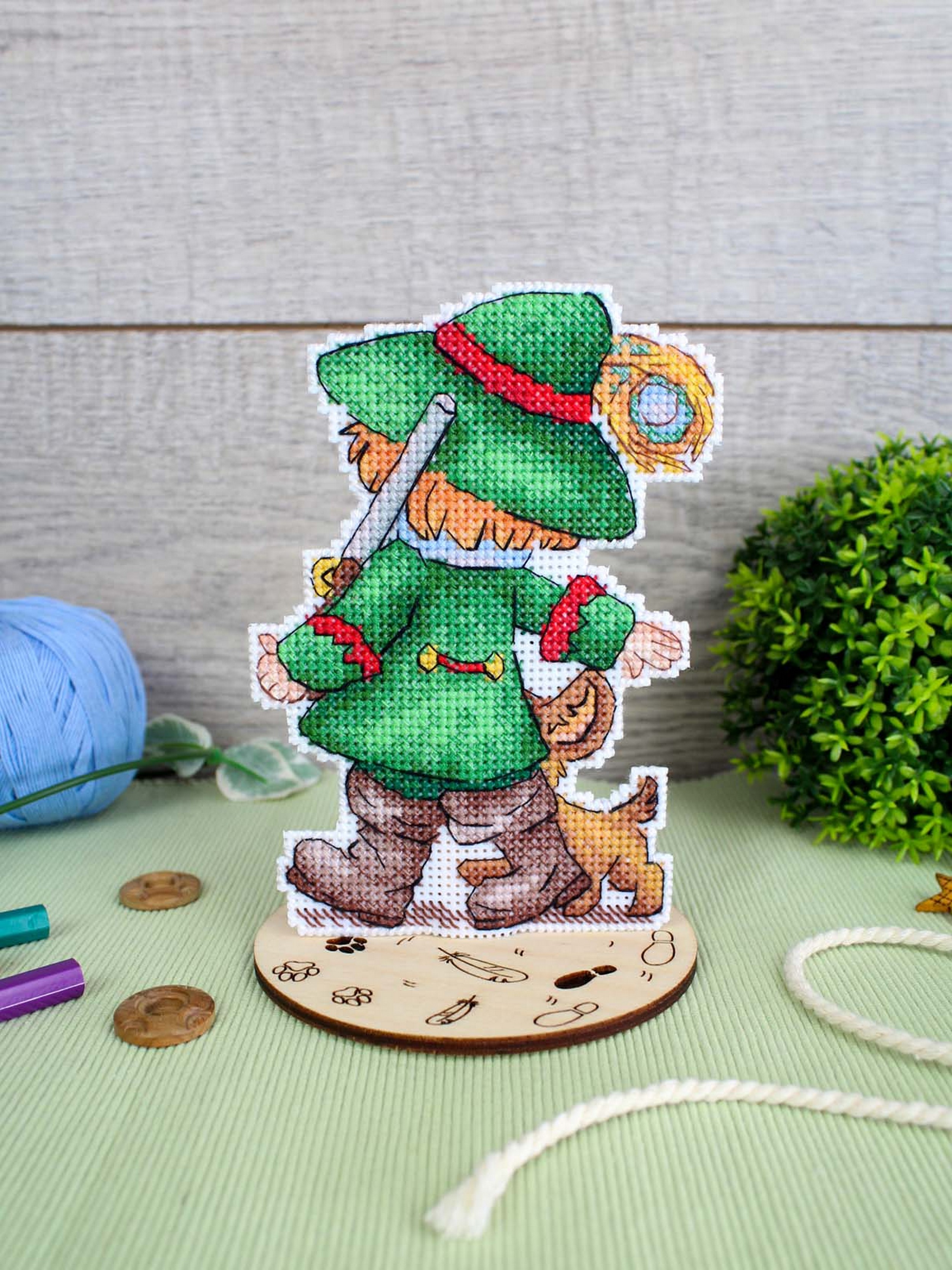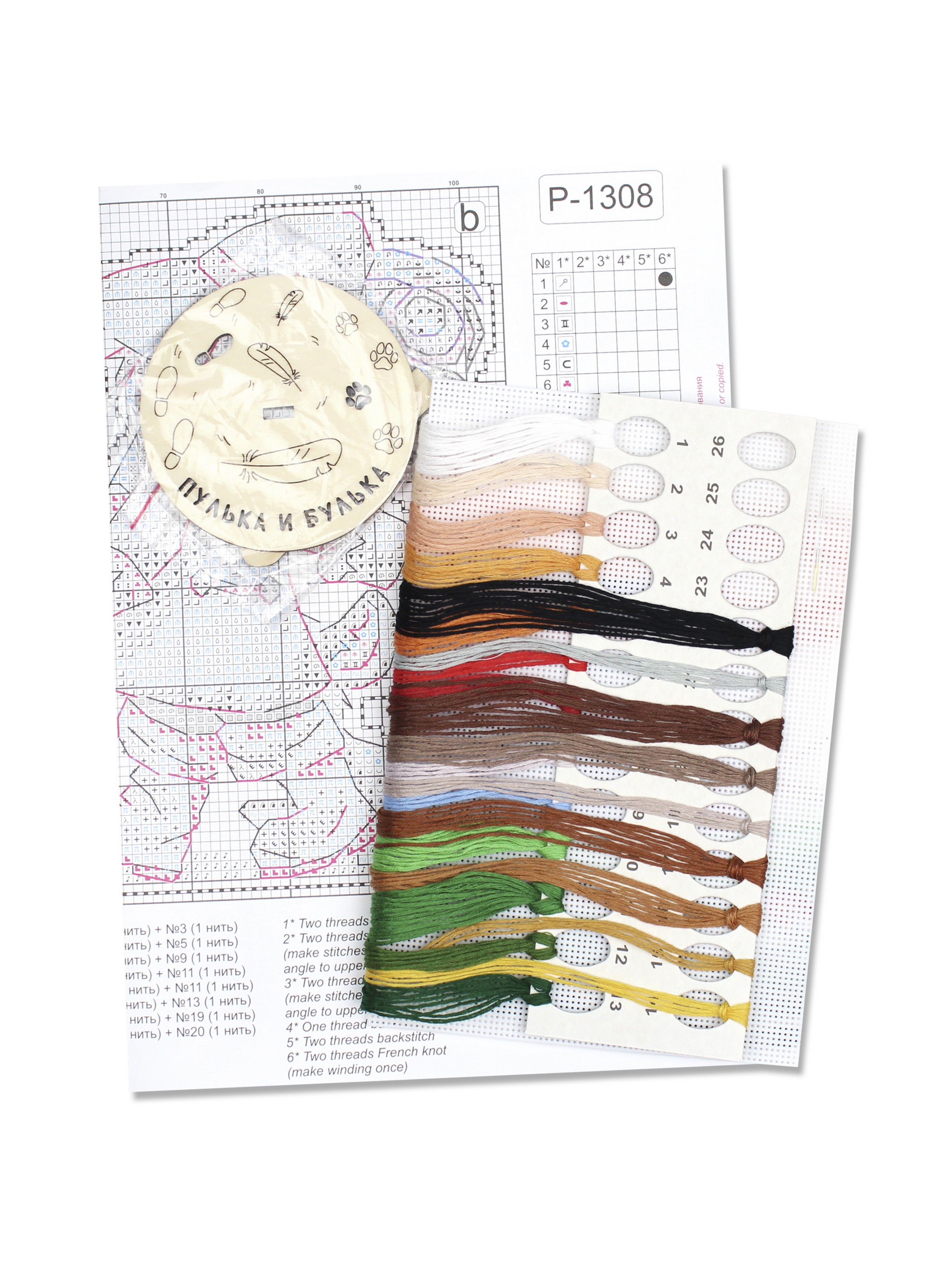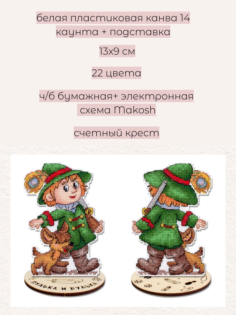 Размер 13х9 см. В состав набора вышивки входит: белая пластиковая канва 14 каунта, нитки мулине ПНК им.Кирова 22 цвета, разобранные на органайзере, игла, схема бумажная и электронная Makosh, руководство по вышиванию. Техника вышивания: счетный коест. Полная зашивка. Дополнительные элементы: деревянная подставка.