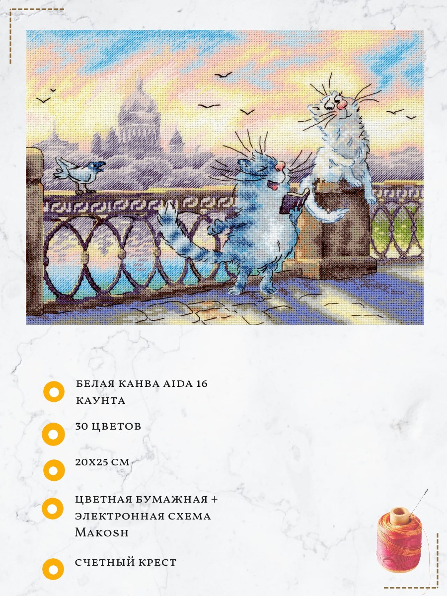 Размер: 20*25 см. В состав входит: белая хлопчатобумажная канва 16 каунта, нитки мулине Гамма 30 цветов, разобранные на органайзере, игла, бумажная цвето-символьная схема и электронная схема Makosh, вышивальная линейка, нитковдеватель, руководство по вышиванию.. Техника вышивания: счетный крест.