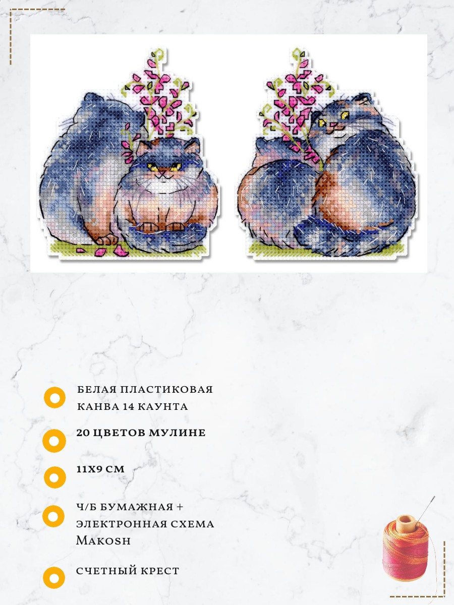 Размер 11х9 см. В состав набора вышивки входит: белая пластиковая канва 14 каунта, нитки мулине ПНК им.Кирова 20 цветов, разобранные на органайзере, игла, схема бумажная и электронная Makosh, руководство по вышиванию. Техника вышивания: счетный коест. Частичная зашивка.