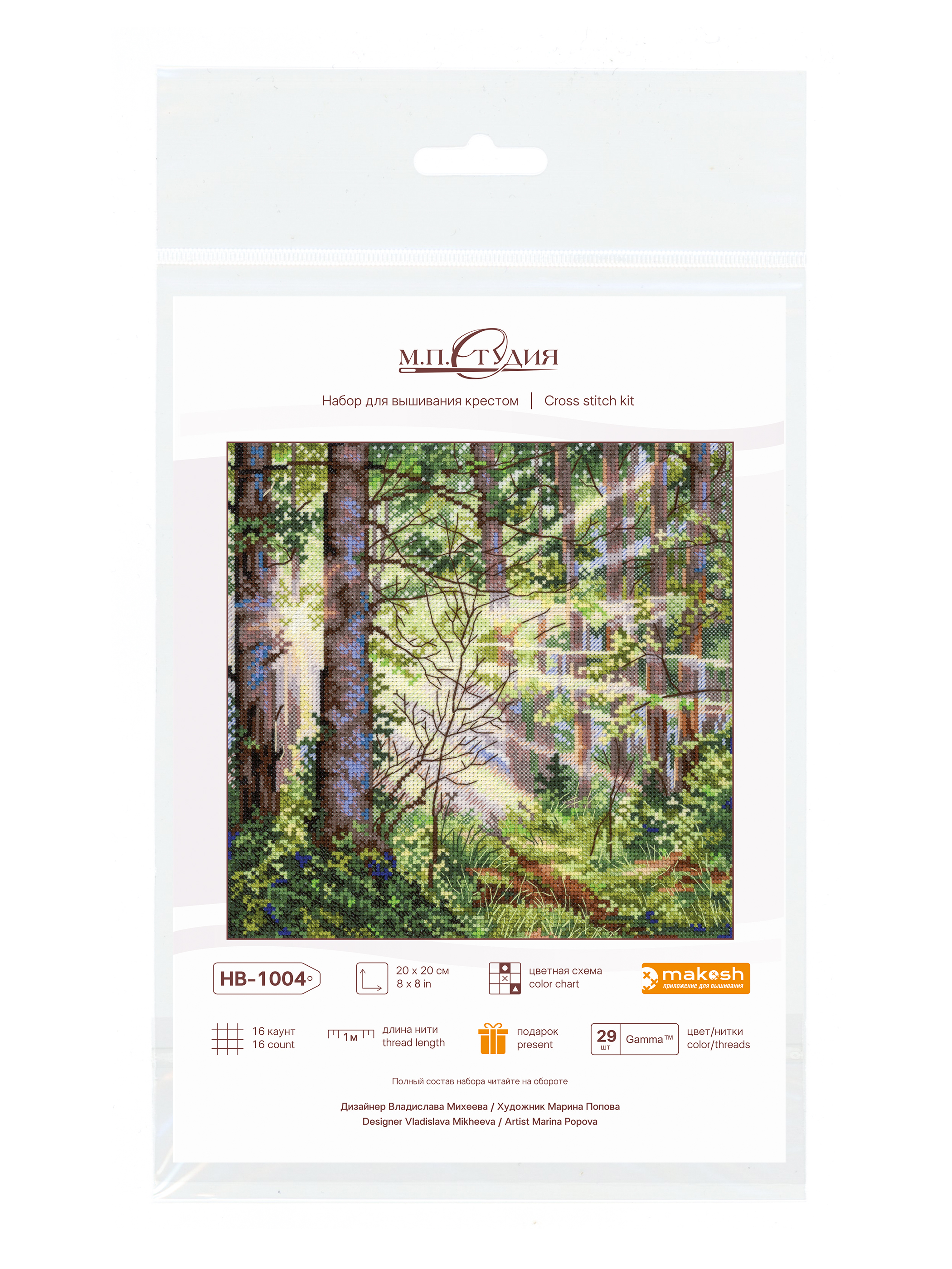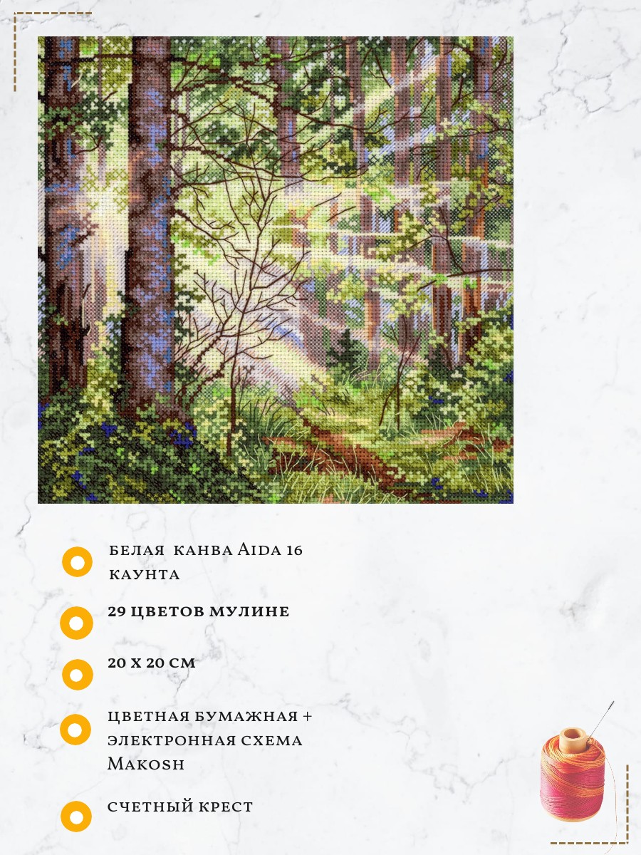 Размер: 20*20 см. В состав входит: белая хлопчатобумажная канва 16 каунта, нитки мулине Гамма 29 цветов, разобранные на органайзере, игла, бумажная цвето-символьная схема и электронная схема Makosh, вышивальная линейка, нитковдеватель, руководство по вышиванию.. Техника вышивания: счетный крест.