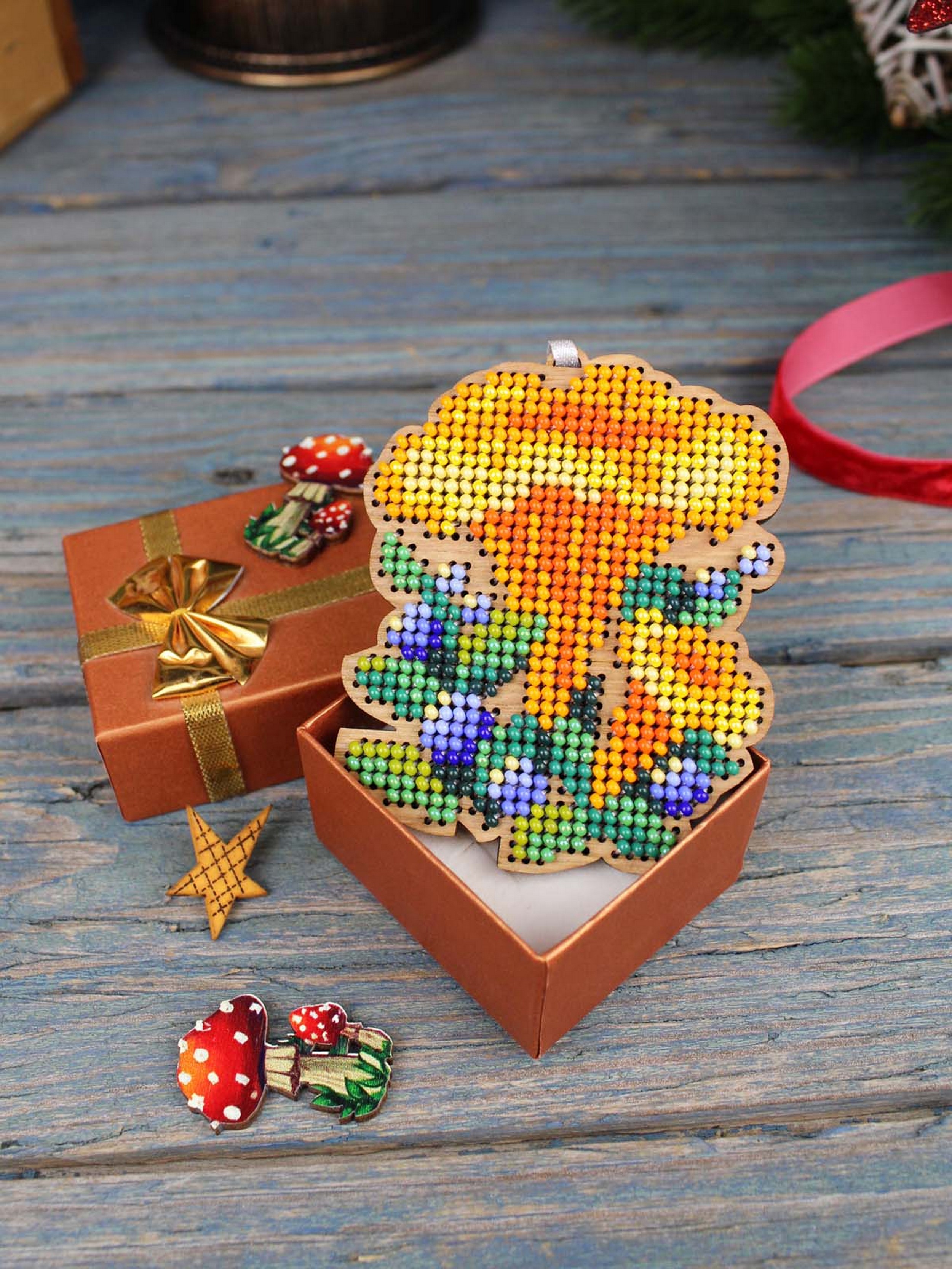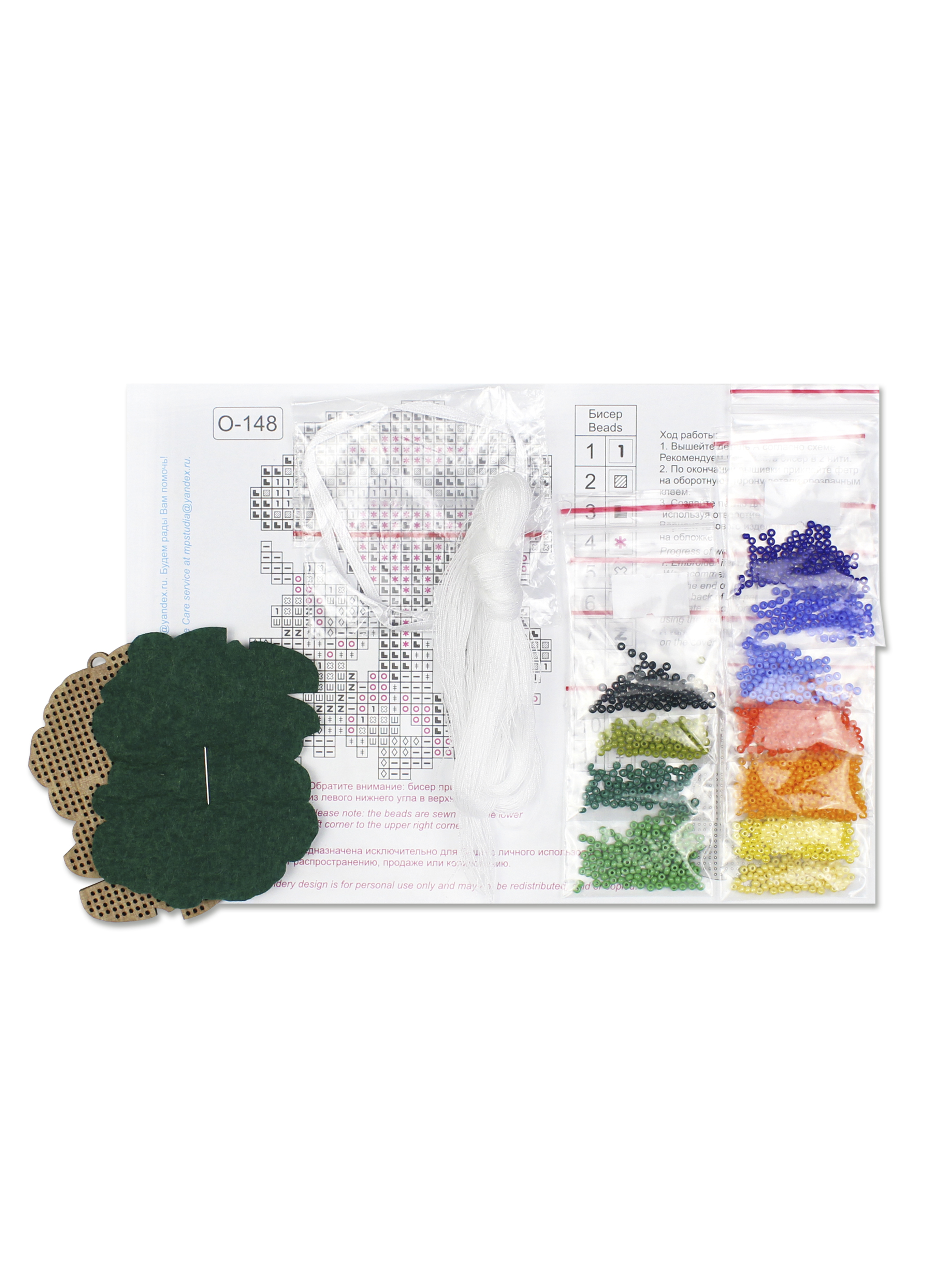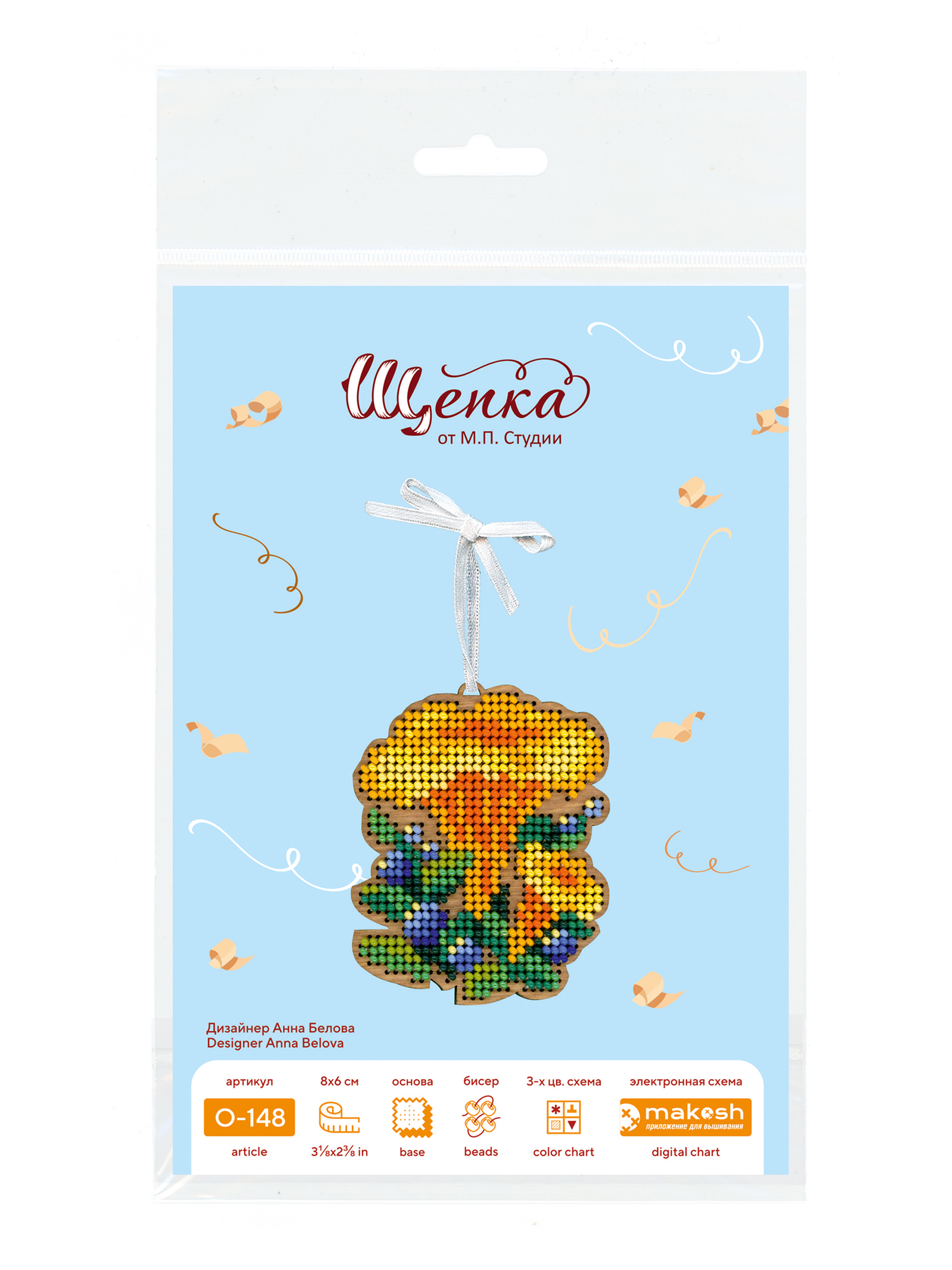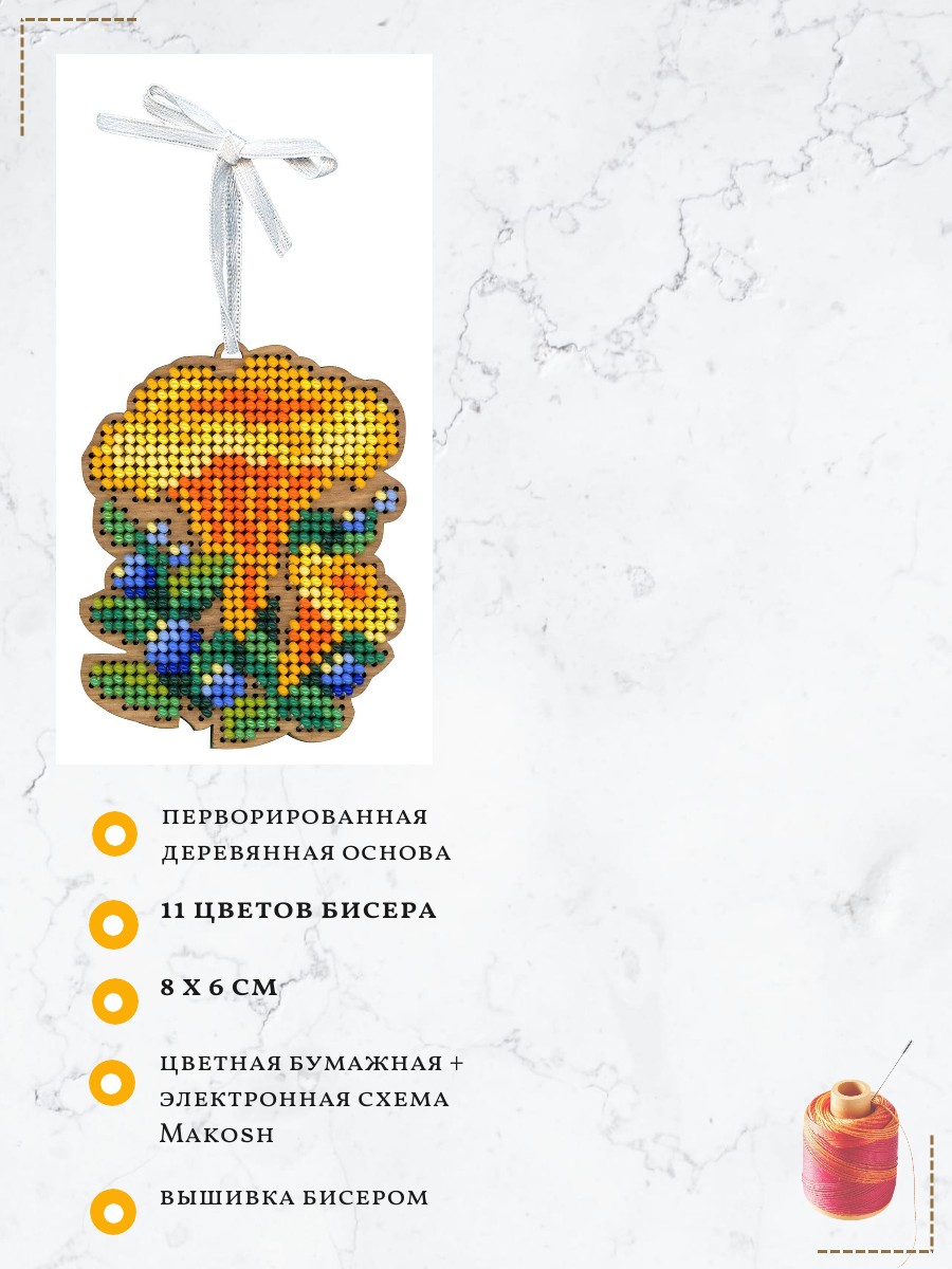 Состав: тонированная перфорированная деревянная основа, бисер Preciosa 11 цветов, фетр для обработки задника, игла, швейные нити, лента, схема и руководство по вышиванию, электронная схема Makosh.