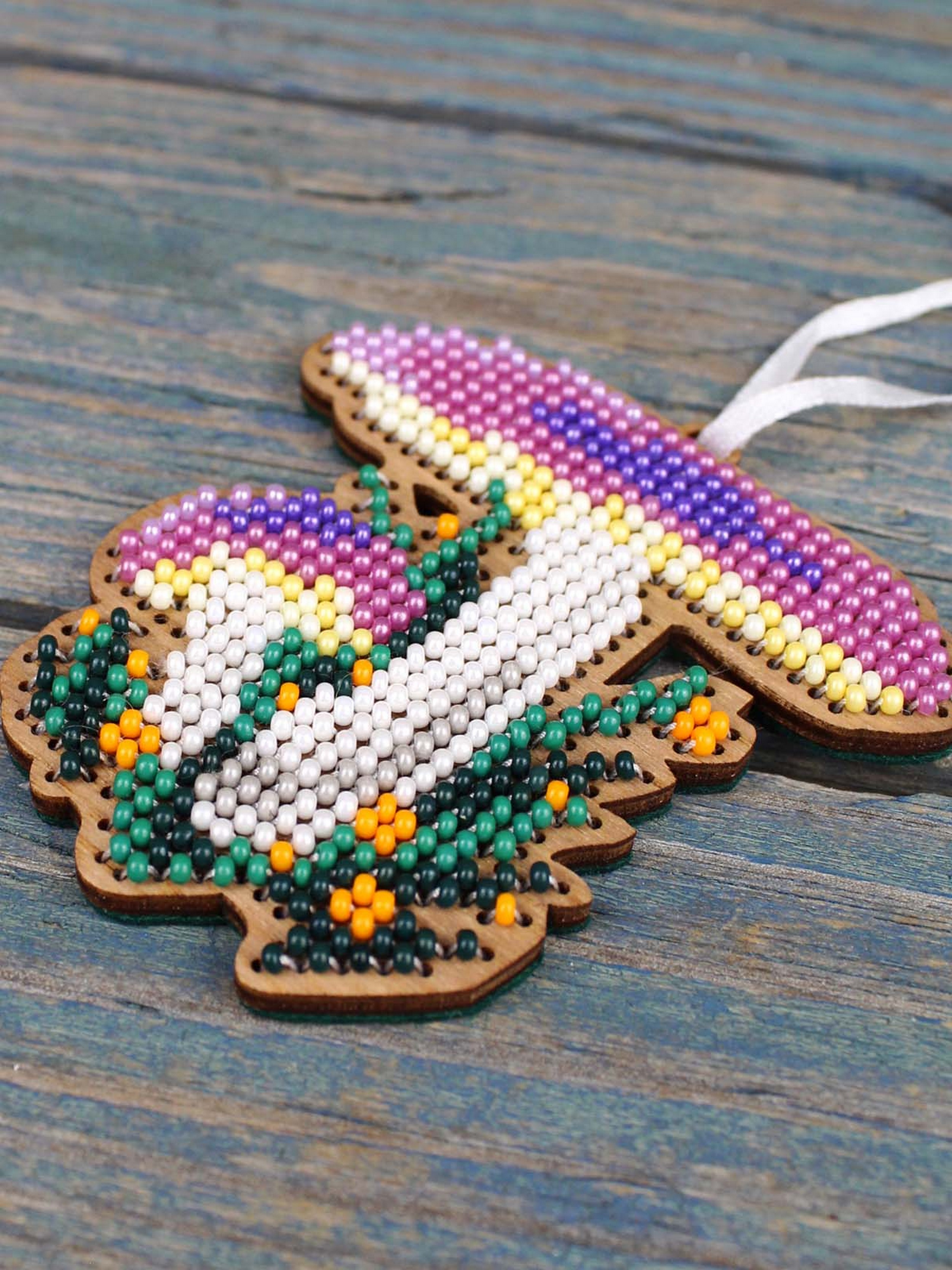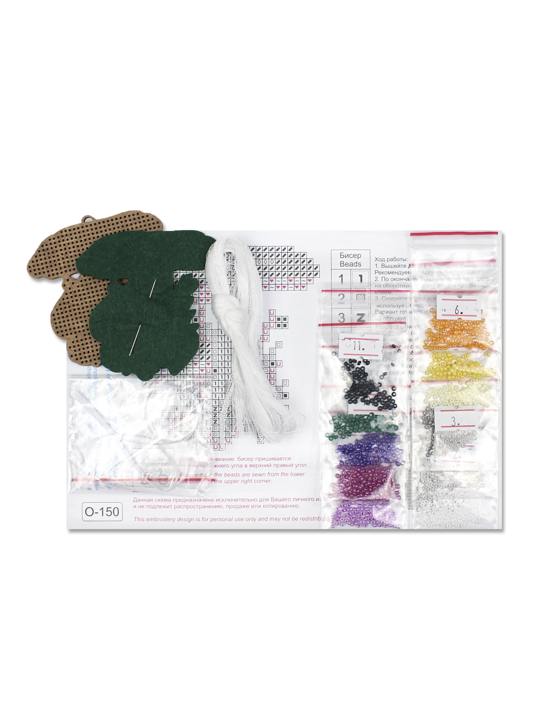 Состав: тонированная перфорированная деревянная основа, бисер Preciosa 11 цветов, фетр для обработки задника, игла, швейные нити, лента, схема и руководство по вышиванию, электронная схема Makosh.