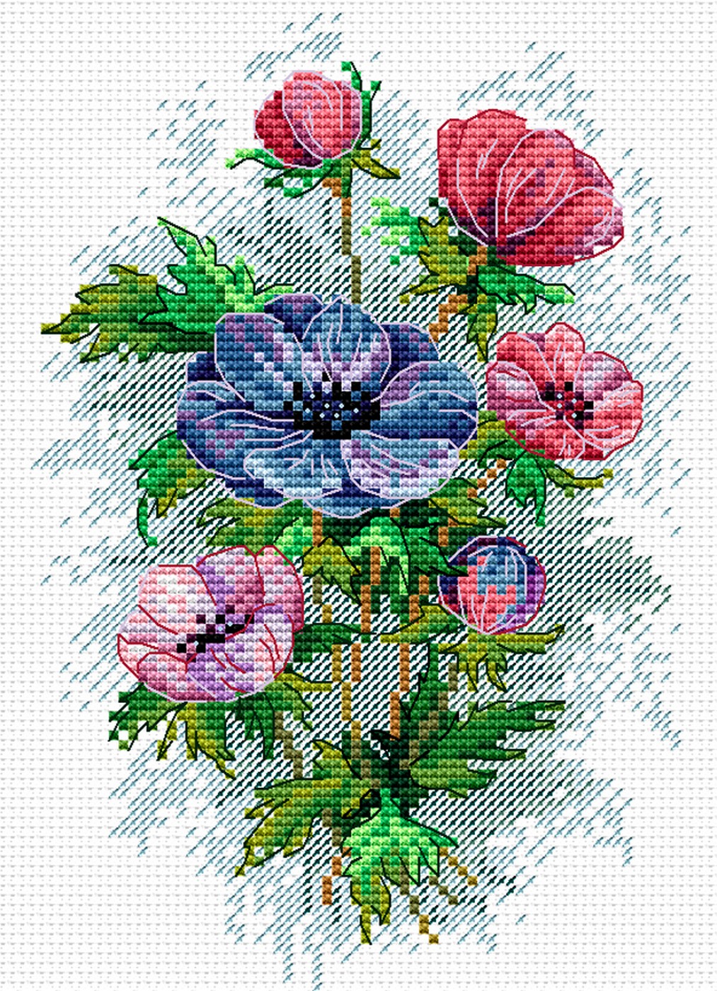 В состав набора входит: канва №14, нитки мулине ПНК им. Кирова 19 цветов, черно-белая схема, инструкция.